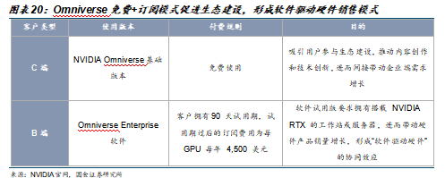 目前,个人创作者、设计师和开发者可免费使用NVIDIA Omniverse的基础版本,目的是降低设计技术门槛,吸引用户参与生态建设,通过培养用户群体,推动内容创作和技术创新,进而间接带动企业端需求增长。针对企业用户,NVIDIA Omniverse专门推出了Omniverse Enterprise软件,企业用户可拥有90天试用期,试用期过后的订阅费用为每GPU每年4,500美元。但该软件试用版要求拥有搭载NVIDIA RTX的工作站或服务器(官网建议要求具有16GB VRAM的支持RTX的GPU)。这种销售模式将在一定程度上带动硬件产品(GPU等)销量增长,形成“软件驱动硬件”的协同效应。