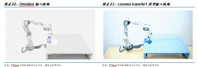 基于Omnibot开发平台进行数据增强模型实测显示,使用NVIDIA Research官网上的视频案例作为模型输入,视频中一个机械臂正在移动物体,我们给cosmos transfer 1模型第一个的问题是:“给视频中的机械臂加一个底座”,可以看到模型可以快速理解机械臂的底部位置在哪里并完成生成动作;给cosmos transfer 1模型第二个的问题是:“给视频中的桌子变成蓝色的,并给背景加上光线”,模型基于用户的提示词可以快速执行并生成可用的工业化结果。