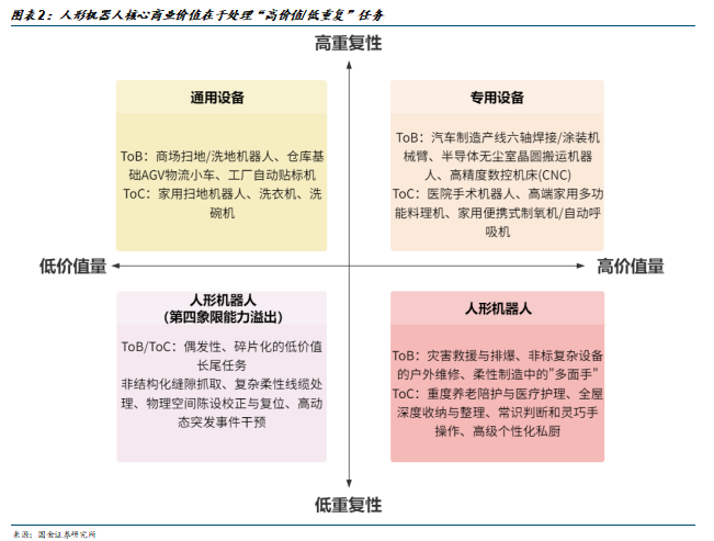 人形机器人的商业化价值几乎必然面向“高价值/低重复”任务。我们将机器人面向的商业场景抽象为四大象限。第一象限(高重复、高价值)是典型的专用设备领域,如汽车组装车间的机械臂或医疗领域的达芬奇手术机器人,客户愿意为特定高价值任务买单,但设备泛化性弱;第二象限(高重复、低价值)多由通用型自动化设备主导,如仓储AGV或家用扫地机,以标准化方案解决低附加值劳动;我们认为,人形机器人由于初期研发成本较高,其必须面向具有高额支付意愿的“高价值”领域;同时,其通用形态与泛化智能的溢价,只有在面对非标准化、高度复杂的“低重复性”任务时才能得到真正释放。因此,人形机器人真正的星辰大海在于第四象限(低重复、高价值)。此外,第三象限(低重复、低价值)中长尾且琐碎的日常杂务(如捡拾零散纸团),目前并不具备独立的商业化土壤,我们预计这类场景将在第四象限核心技术成熟后,受益于技术外溢被顺带解决。