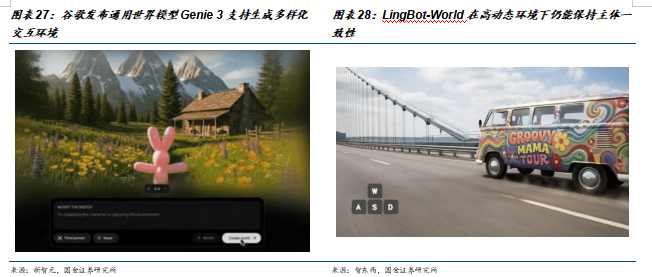 世界模型的持续迭代,使机器人可在虚拟环境中精准预判物理规律与动态变化。北美方面,谷歌DeepMind发布的Genie 3首次实现了仅凭文本提示即可生成720P分辨率、24FPS的高动态三维交互世界,该模型不仅具备长达数分钟的物理一致性与空间记忆,还能对导航、环境干预等外部操作做出符合物理定律的实时响应。国内方面,蚂蚁灵波科技全面开源了LingBot-World及其衍生模型,实现了极低延迟的键盘/鼠标实时操控与长达10分钟的无损连续生成,克服了长时漂移与细节塌陷问题,且首创了自回归“视频-动作”一体化框架,支持机器人同步推演未来物理状态并输出动作指令。这种内化了物理因果律、空间结构与长时交互能力的新一代世界模型,为具身智能提供了可靠的虚拟仿真与交互推演支撑,其生成的海量高质量交互合成数据,可缓解机器人产业的数据供给瓶颈。