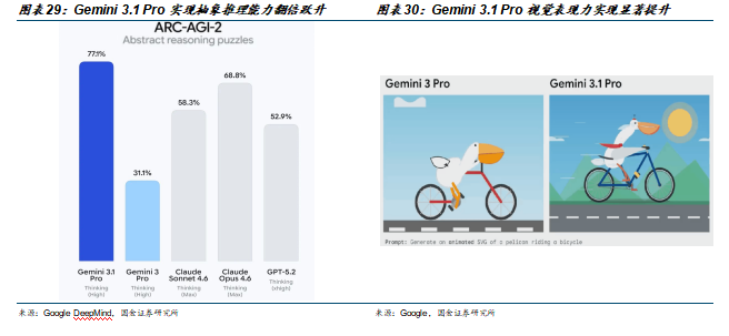谷歌此前发布的 Gemini 3.0 Pro 已展现出强劲的视觉解析能力:在多模态屏幕理解任务(Screenshot-Pro)中得分达 72.7%,显著高于 Gemini 2.5 Pro(11.4%)和 Claude 4.5(36.2%);在高阶视觉逻辑推理指标 ARC-AGI-2 上,得分由 Gemini 2.5 Pro 的 4.9% 提升至 31.1%,同样领先 GPT-5.1(17.6%)。在此基础上,最新迭代的 Gemini 3.1 Pro 实现能力再次跃升,其 ARC-AGI-2 抽象推理指标得分高达 77.1%,较 3.0 版本实现翻倍提升,并大幅领先同期的 Claude Opus 4.6(68.8%)与 GPT-5.2(52.9%)。核心指标的快速提升,印证了多模态大模型在空间抽象与逻辑推理能力上的高速进化。这一底层能力突破,将显著提升人类视频向机器人训练数据的转化与映射效率,充分盘活全网海量存量视频资源,为机器人理解真实物理世界提供持续、高质量的数据支撑。