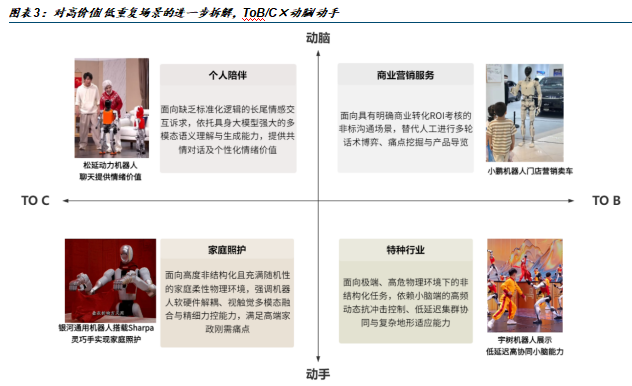 在“高价值、低重复”的核心市场中,基于机器人能力侧重点(大脑思考泛化/小脑动作泛化)与客群属性(ToB/ToC)的进一步解耦,人形机器人的商业化落地可划分为四大细分场景。