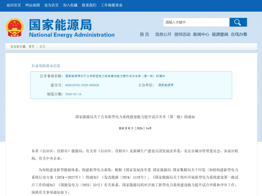 国家能源局规划司司长任育之表示,2026年作为“十五五”规划开局之年,将加力建设新型能源基础设施,壮大非化石能源供给体系,构建适配高比例新能源的新型电力系统。此次首批试点名单的正式落地,是上述部署的具体推进举措之一。