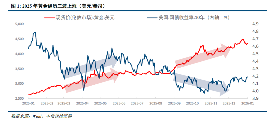 2025年推升黄金上涨的三个逻辑,将在2026年迎来收敛。这是我们预期的2026年金价走势第一种情形,也是概率较高的情形。换言之,2026年概率上很难见到黄金表现强如2025年。