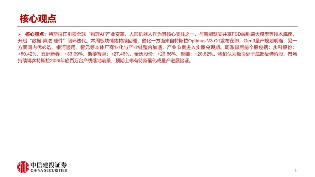 特斯拉正引领全球“物理AI”产业变革,人形机器人作为其核心支柱之一,与智能驾驶共享FSD端到端大模型等技术底座,开启“数据-算法-硬件”闭环迭代。本周板块情绪持续回暖,催化一方面来自特斯拉Optimus V3 Q1发布在即、Gen3量产规划明确,另一方面,产业节奏进入实质兑现期。我们认为板块处于底部反弹阶段,市场持续博弈特斯拉2026年底百万台产线落地前景,预期上修有待新催化或量产进展验证。