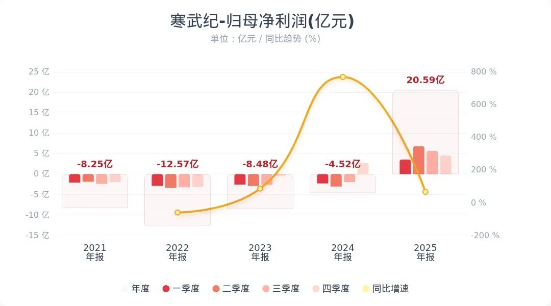 寒武纪今日发布2025年度业绩快报,报告期内公司实现营业收入64.97亿元,同比增长453.21%,归属于母公司所有者的净利润为20.59亿元,同比扭亏为盈。