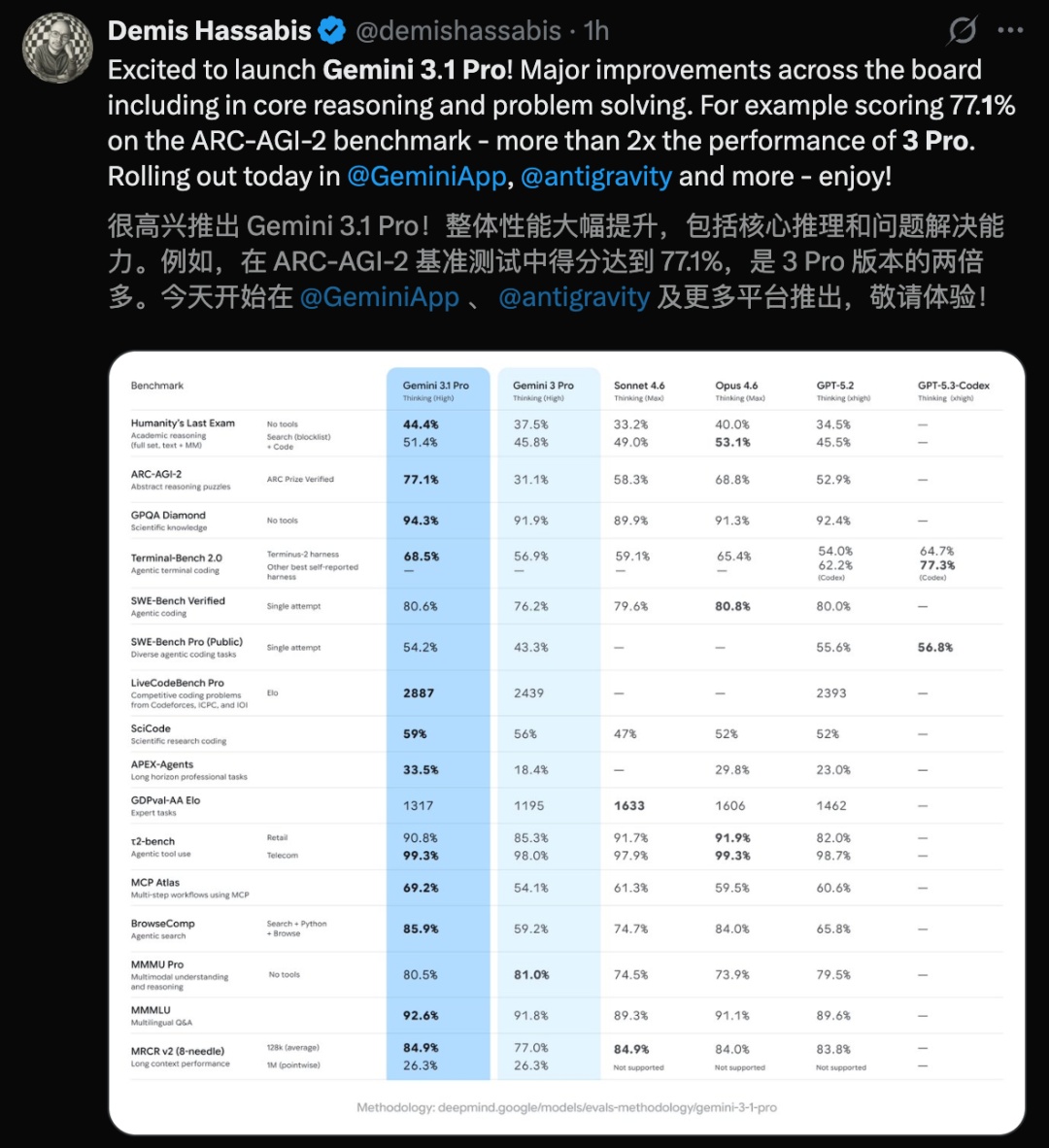 最新一代旗舰Gemini 3.1 Pro,在多项基准测试中力压GPT-5.2,甚至是最新代码模型GPT-5.3-Codex。