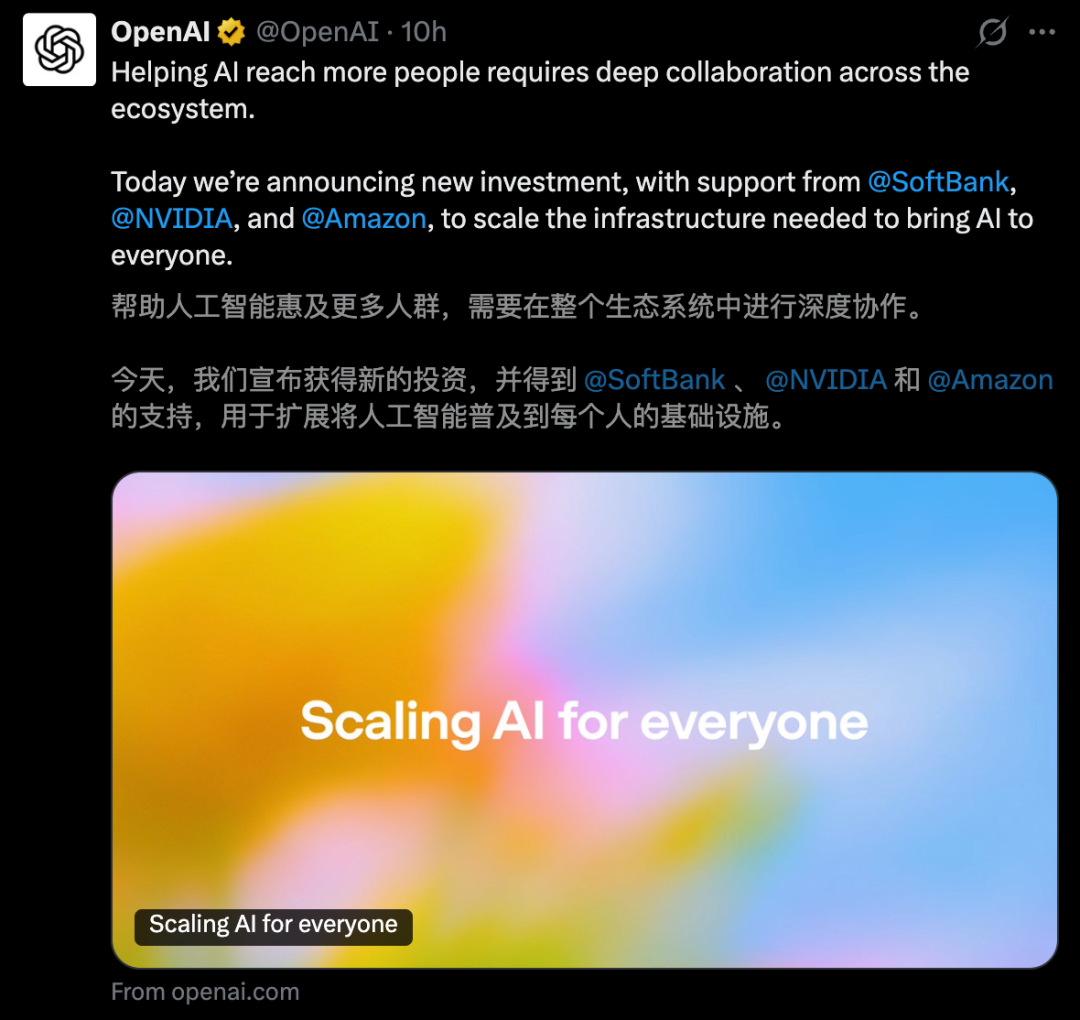 为此,OpenAI与亚马逊、英伟达、软银达成了深度合作关系。