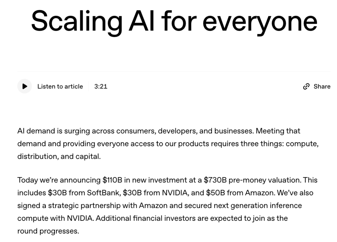 就在今天,奥特曼官宣:OpenAI从英伟达、软银和亚马逊手中,拿下了1100亿美元融资。