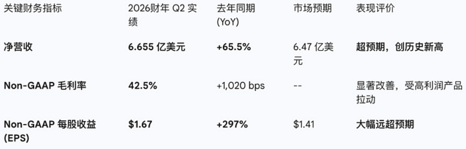 作为CPO产业链上游核心供应商,Lumentum公布的2026财年第二季度财务业绩,成为CPO需求即将爆发的最强佐证之一。该季度公司营收实现6.655亿美元,同样高于6.467亿美元的市场预期,营收同比增幅更是高达65%,充分彰显了投资者对其把握光学技术新兴机遇、持续保持增长势头的坚定信心。