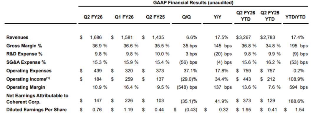从业务结构来看,数据中心与通信板块已成为Coherent的核心增长引擎,占本季度总营收的72%,同比大幅增长34%,背后正是AI数据中心建设带来的阶跃式需求爆发,而CPO作为下一代光互联的核心技术,已成为该板块的重要增长抓手。