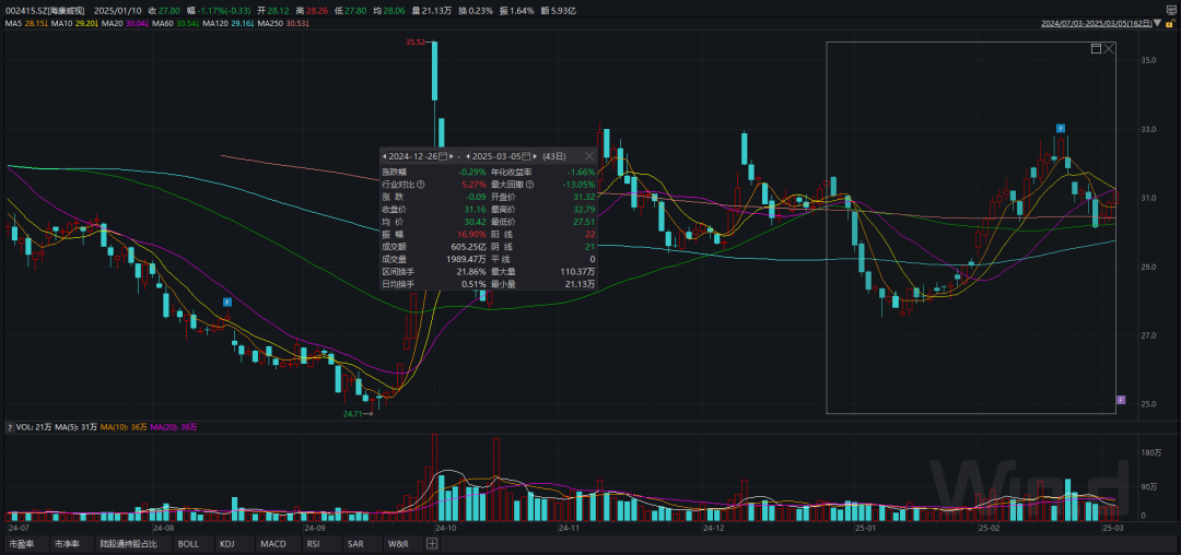 同时,Wind数据显示,2024年12月26日至2025年3月5日收盘,海康威视的股价涨跌幅为-0.29%。换言之,公司的大手笔回购对股价的提振效果并不明显。