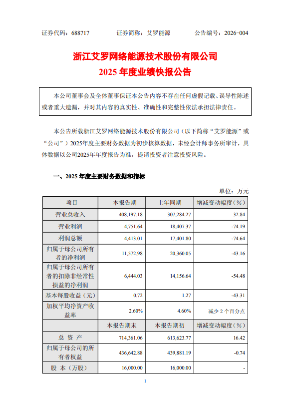 2月27日,艾罗能源(688717)发布2025年业绩快报。