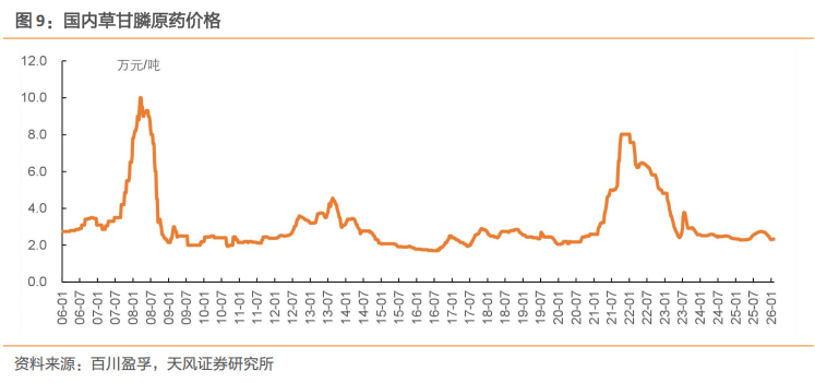 当前国内草甘膦原药价格约2.3万元/吨(含税),为历史偏低水平,行业整体处于盈亏边缘;而草甘膦已属于我国限制类产品(理论上不允许新增投资),叠加全球出口主导,供应总量约束效应较强。