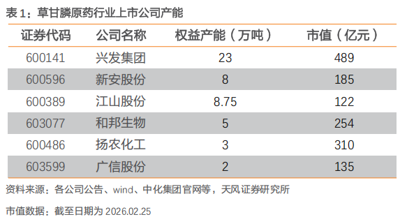 草甘膦原药行业上市公司:兴发集团(23万吨)、新安股份(8万吨)、江山股份(8.75万吨)、和邦生物(5万吨)、扬农化工(3万吨)、广信股份(2万吨)。