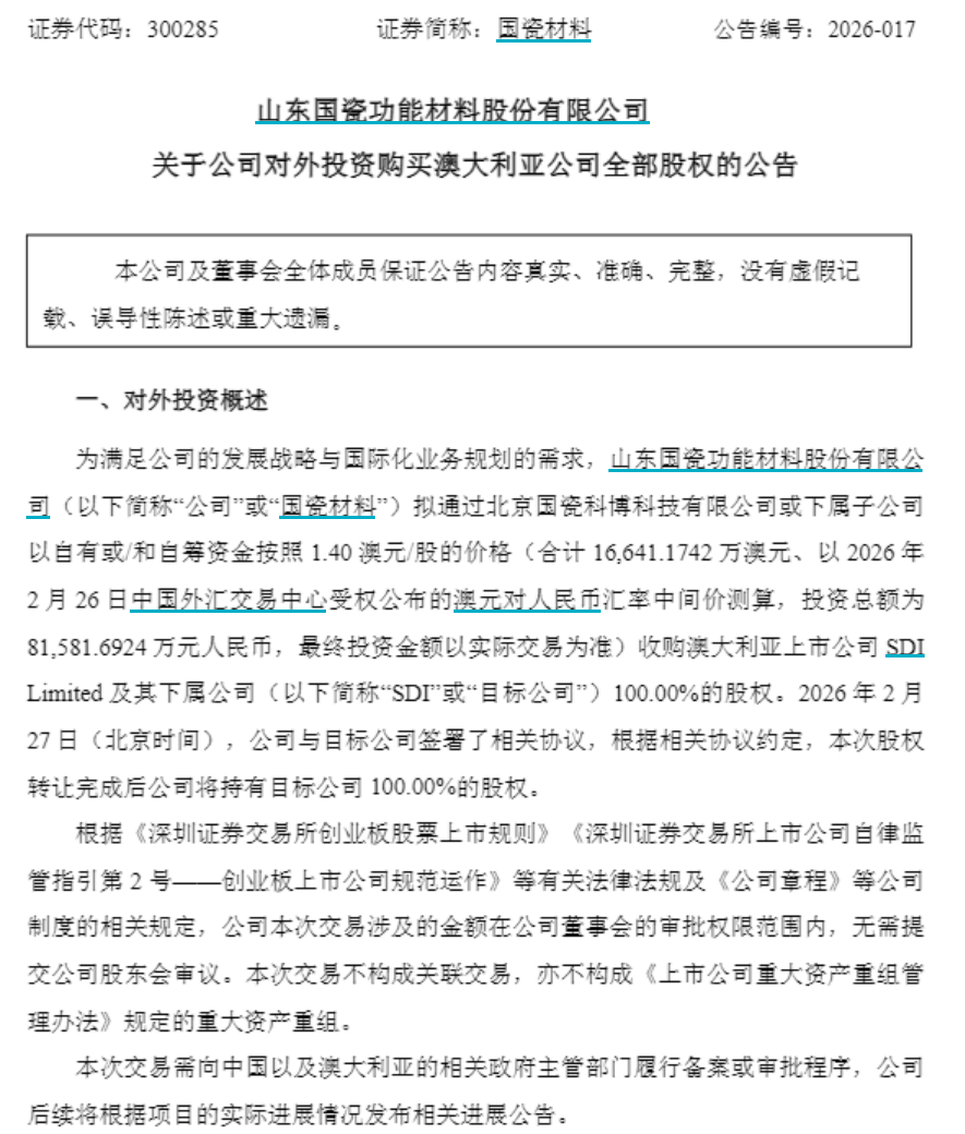 2月27日晚,国瓷材料(300285.SZ)发布公告称,拟通过北京国瓷科博科技有限公司或下属子公司以自有或自筹资金按照1.4澳元/股的价格收购澳大利亚上市公司SDI Limited及其下属公司(下称“SDI”)100%的股权,交易总价16641.17万澳元(约8.16亿元人民币,按2月26日澳元兑人民币中间价测算)。资料显示,SDI成立于1972年,总部位于澳大利亚维多利亚州墨尔本市,1985年在澳大利亚证券交易所上市,是澳大利亚专业牙科材料领域的领先制造商及全球分销商。SDI主营研发、生产并销售各类修复性牙科产品,目标客户为临床端用户,产品包括美学修复类材料(复合树脂、粘接剂、水门汀等)、专业牙齿美白类材料、银汞合金类材料及配套专用辅助设备。所有产品均在澳大利亚维多利亚州生产,并销往全球100多个国家和地区。截至2025年12月31日,SDI仅有一位持股5%以上主要股东,即由SDI董事长Jeffrey Cheetham所控制的CURRANGO PASTORAL COMPANY PTY LTD,持股数为5069.13万股,持股比例达42.65%。从财务数据来看,2024年7月到2025年6月,SDI实现营业收入1.10亿澳元,净利润达到1308.4万澳元。截至2025年6月末,SDI资产总额为1.41亿澳元,净资产为1.03亿澳元。对于此次对外投资的目的,国瓷材料表示,有利于扩充产品线,形成新的利润增长点。由于SDI拥有成熟的临床端牙科产品线,在牙科材料制造领域积累了丰富的技术与市场经验,公司将与SDI在技术开发、产品生产、市场开拓等多方面开展合作,深入挖掘市场需求。此外,收购有利于实施公司全球化战略发展目标。SDI多年以来深耕澳大利亚、欧洲和北美市场,积极开拓新兴地区市场,在全球范围内具有一定的品牌知名度与广泛的客户群体。SDI的全球分销网络和客户服务体系将加速公司在牙科修复材料的全球化布局,契合公司口腔业务的国际化、多元化、品牌化战略。值得注意的是,为了保证交易推进,双方在协议中设定了严格的约束及排他性条款。在排他期内,SDI不得直接或间接招揽、鼓励任何竞争方案,也不得与第三方就竞争方案进行谈判。若SDI董事会成员违规改变推荐意向或支持竞争方案,SDI必须向收购方支付最高不超过166.4万澳元的补偿费。反之,若因收购方违约(如未履行支付对价义务)导致协议终止,收购方也需向目标公司支付最高166.4万澳元的反向补偿费。官网信息显示,国瓷材料成立于2005年4月,本部位于东营,2012年1月在深圳创业板上市。主要从事各类高端陶瓷材料及制品的研发、生产和销售,形成了电子材料、催化材料、生物医疗材料、新能源材料、精密陶瓷和数码打印及其他材料六大业务板块,产品广泛应用在电子信息和通讯、汽车及工业催化、生物医疗、新能源汽车、半导体、建筑陶瓷、太阳能光伏等领域。经过多年发展,国瓷材料已在华北、东北、长三角、珠三角以及欧美、东南亚等地区设立生产、研发和办事机构,在全球范围内设置客户服务中心,初步完成了在全球高端陶瓷新材料领域的产业布局,成为国内重要的高端功能陶瓷材料制造商。财务数据显示,2025年前三季度,国瓷材料实现营业收入32.84亿元,同比增长10.7%;归母净利润为4.89亿元,同比增长1.5%。
