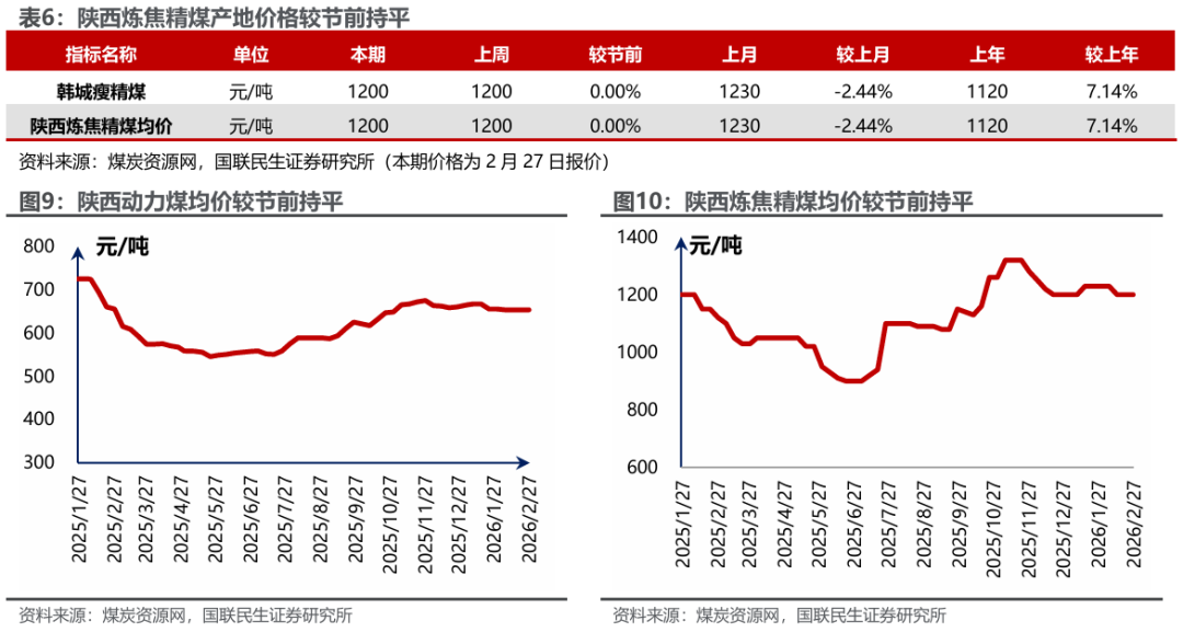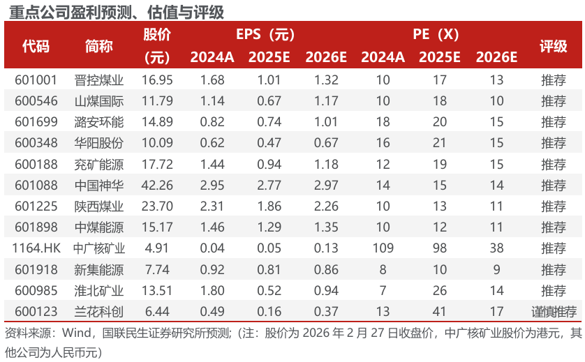 海外供给收缩催化内贸煤需求,煤价有望持续上涨。节后产地及港口煤价持续上涨,海外方面,印尼受RKAB审批进度及斋月影响供应偏紧、波罗的海冰情限制俄罗斯煤炭出口,海外市场煤炭供给扰动增强,国际煤价持续上涨,进口煤优势不再,内贸煤需求提升,此外近期伊朗局势推升油价,伊朗作为全球第二大甲醇生产国,其甲醇约75%出口至中国,2025年中国自伊朗进口甲醇数量占总进口量的56.6%,油化工成本抬升下,煤化工比价优势扩大,预计带动国内煤制甲醇、煤制烯烃需求明显增长;国内方面,节前产区供给收缩,终端日耗虽有所下降,港口库存仍超预期去化,节后供需均缓慢恢复,后续产能核减和下游复工复产节奏加快,低库存对煤价支撑作用亦较强。海内外双重催化下,煤价有望持续上涨。全年来看,供给收缩力度加强并回到常态化监管下,煤价有望回到 2023-2024 年供需基本平衡状态,价格回升至750-1000元/吨区间季节性震荡运行。板块方面,供需改善,现货比例高、资产负债表改善标的占优,同时山西省2024年已完成超产治理,受本轮“限超产”影响最小,建议关注山西标的。