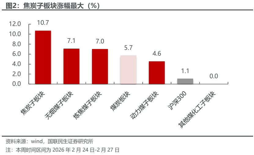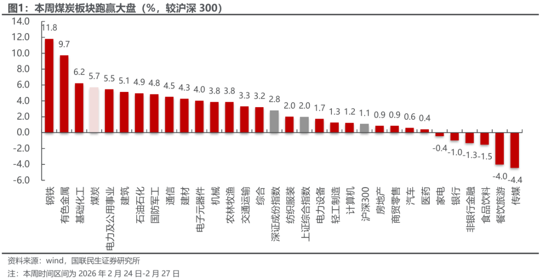 截至2月27日,本周中信煤炭板块周涨幅5.7%,同期沪深300周涨幅1.1%,上证指数周涨幅2.0%,深证成指周涨幅2.8%。