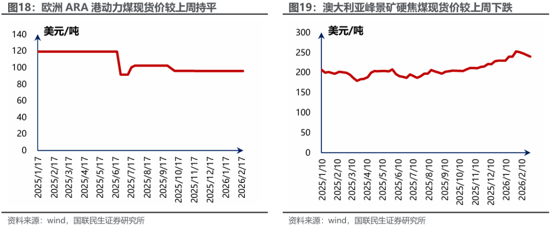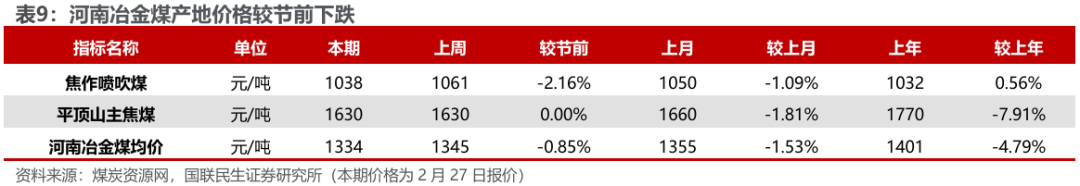 港口焦煤价格持稳,产地焦煤价格下跌。据煤炭资源网数据,截至2月27日,京唐港主焦煤价格为1660元/吨,较节前持平。截至2月26日,澳洲峰景矿硬焦煤现货指数为244.6美元/吨,周环比下跌2.0美元/吨。产地方面,山西高硫较节前下跌30元/吨,长治喷吹煤较节前下跌20元/吨,山西低硫、柳林低硫、灵石肥煤、济宁气煤较节前持平。