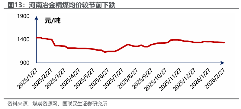 供强需弱,焦煤价格稳中偏弱运行。节后焦煤价格弱稳运行,供给端,产地煤矿陆续复工复产,供应稳步回升;需求端,焦炭提降预期下,焦企按需采购为主,钢厂亦维持刚需采购。假期后焦煤供需格局趋于宽松,后续价格或稳中偏弱运行。