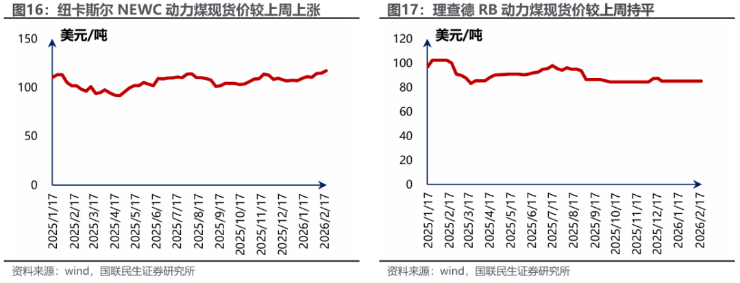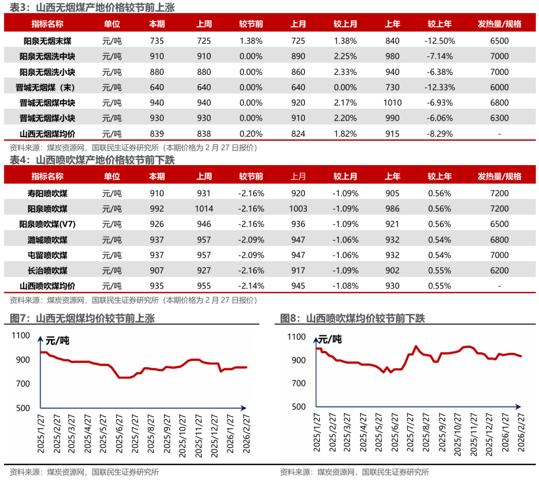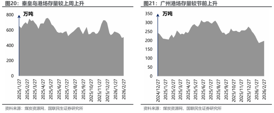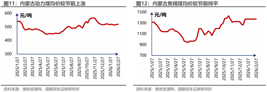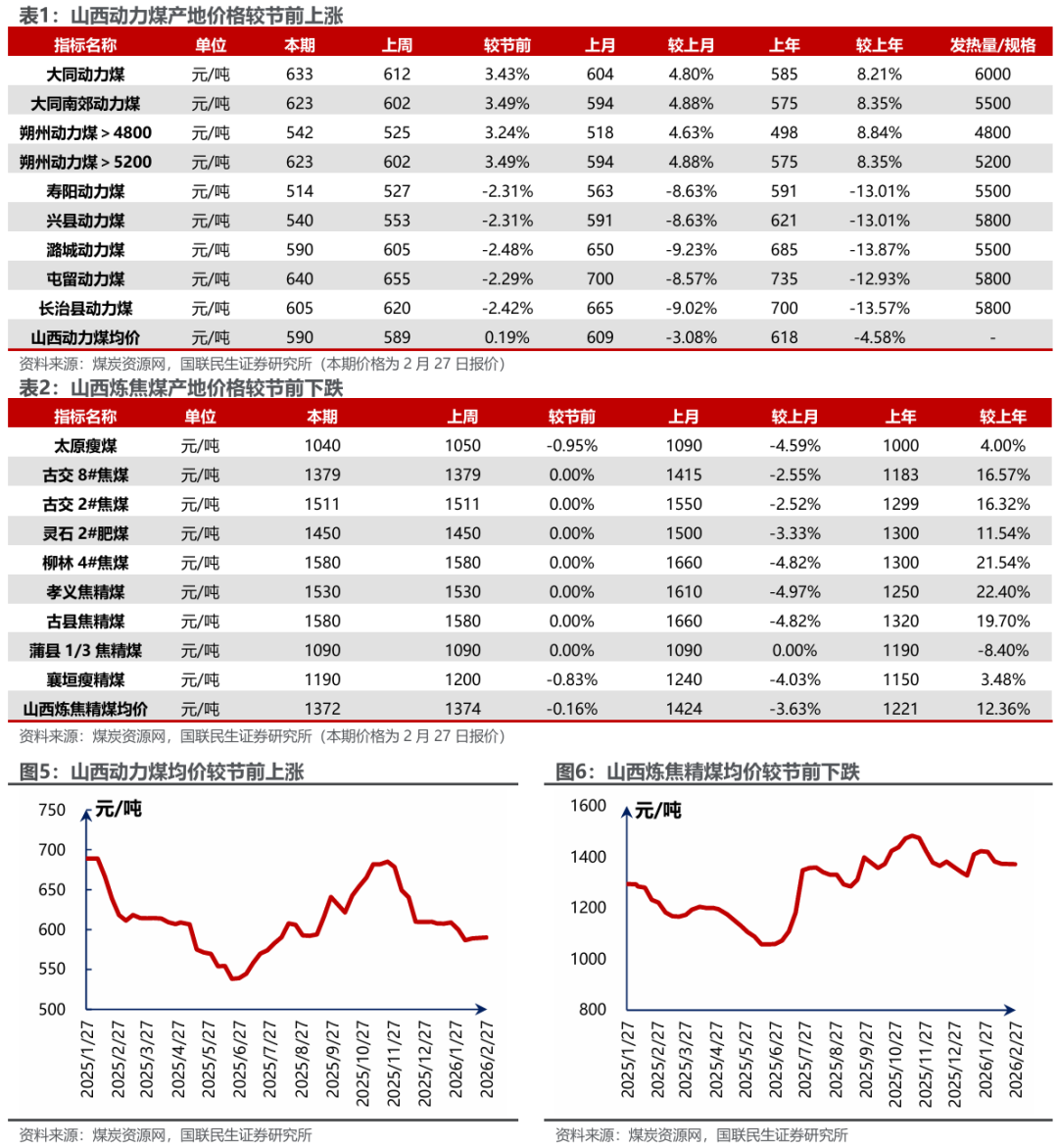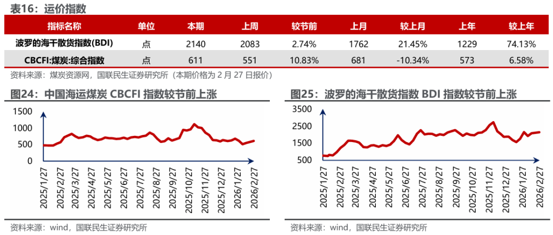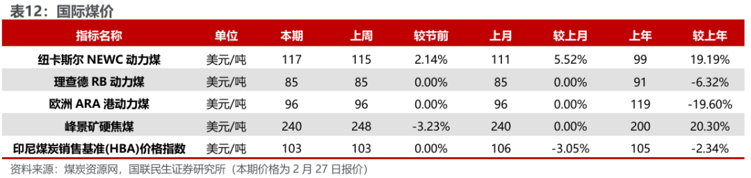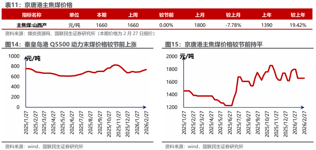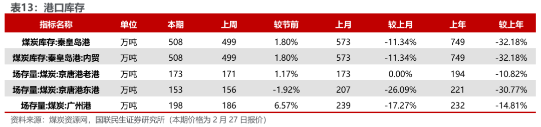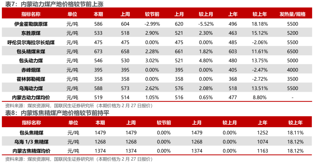 港口及产地煤价上涨。煤炭资源网数据显示,截至2月27日,秦皇岛港Q5500动力煤市场价报收于739元/吨,较节前上涨27元/吨。产地方面,据煤炭资源网数据,山西大同地区Q5500报收于593元/吨,较节前上涨21元/吨;陕西榆林地区Q5800指数报收于601元/吨,较节前上涨3元/吨;内蒙古鄂尔多斯Q5500报收于538元/吨,较节前上涨15元/吨。