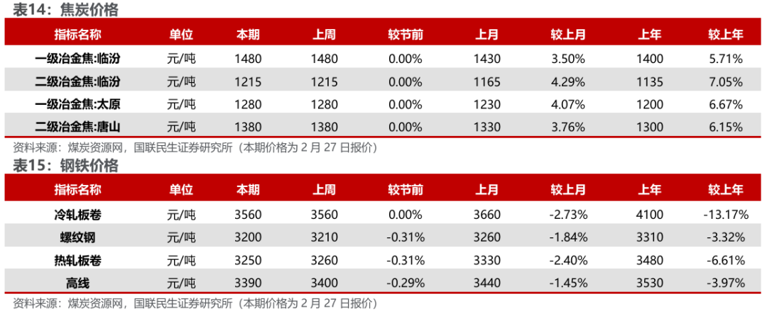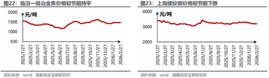 焦炭价格暂稳。据Wind数据,截至2月27日,唐山二级冶金焦市场价报收于1380元/吨,较节前持平;临汾二级冶金焦报收于1215元/吨,较节前持平。港口方面,2月27日天津港一级冶金焦价格为1610元/吨,较节前持平。