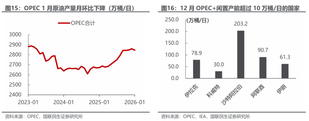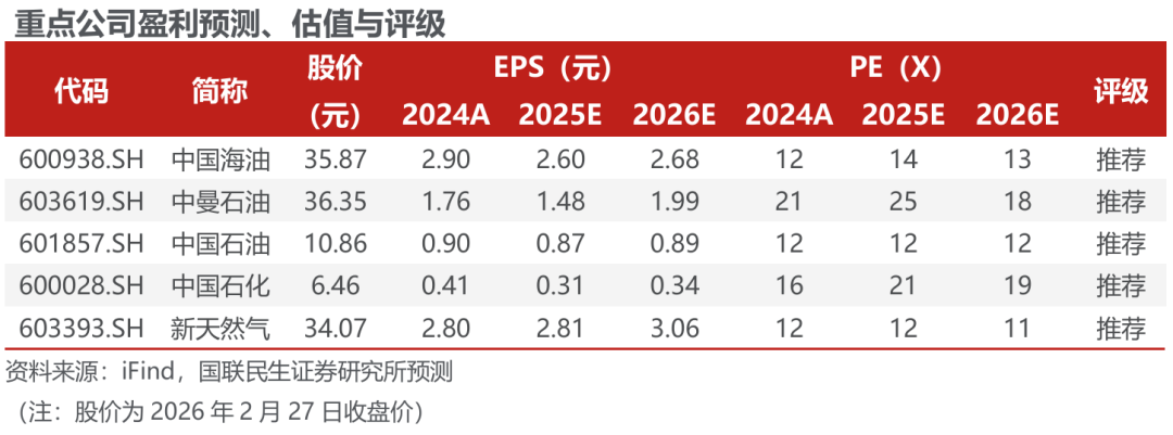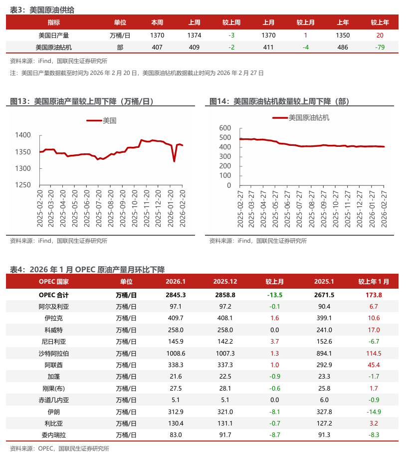 三大石油机构2月月报预期26年原油供给过剩。据国际石油机构2月月报,1)EIA:26年供给、需求增速预期分别上调19、7万桶/日,26年全球供给、需求预测分别为10785、10479万桶/日,过剩306万桶/日。2)OPEC:26年非DOC供给、全球需求增速预期维持不变,26年非DOC供给、全球需求预测分别为6355、10652万桶/日,若DOC维持25Q4的4305万桶/日的石油产量,则全球石油供需过剩8万桶/日。3)IEA:26年供给、需求增速预期分别下调10、8万桶/日,全球供应过剩预期量从384万桶/日下修至373万桶/日。