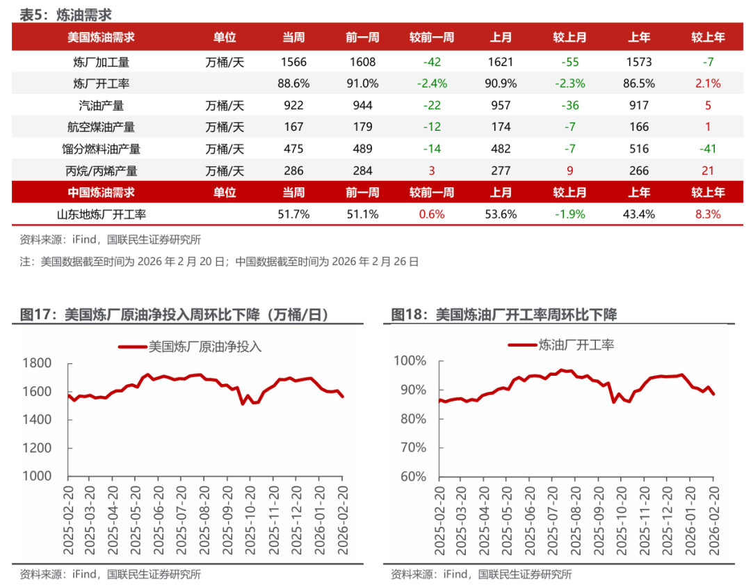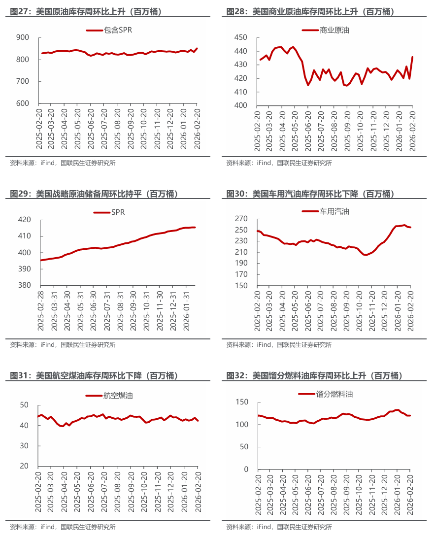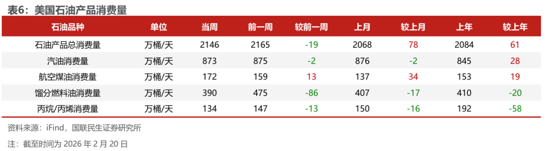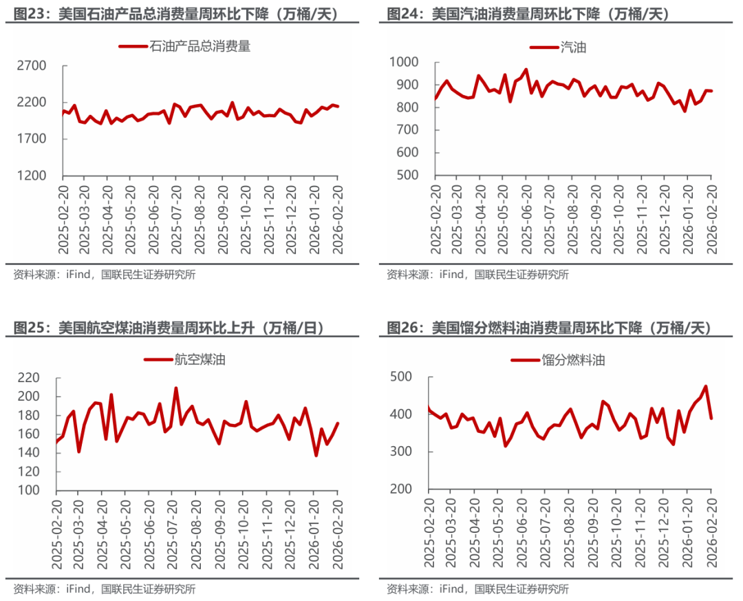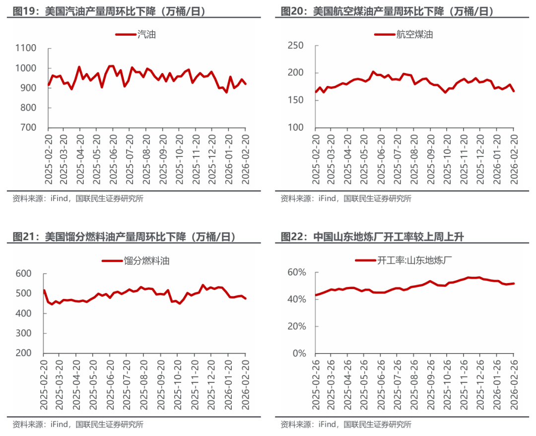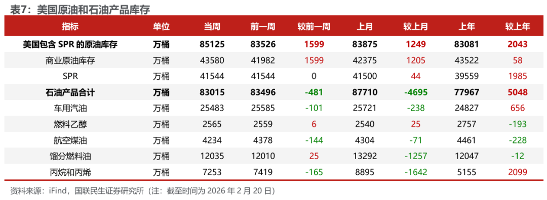 美国原油产量下降,炼油厂日加工量下降。截至2月20日,1)原油方面,美国原油产量1370万桶/日,周环比-3万桶/日。2)成品油方面,美国炼油厂日加工量1566万桶/日,周环比-42万桶/日;炼厂开工率88.6%,周环比-2.4pct;汽油/航空煤油/馏分燃料油产量分别为922/167/475万桶/日,周环比-22/-12/-14万桶/日。
