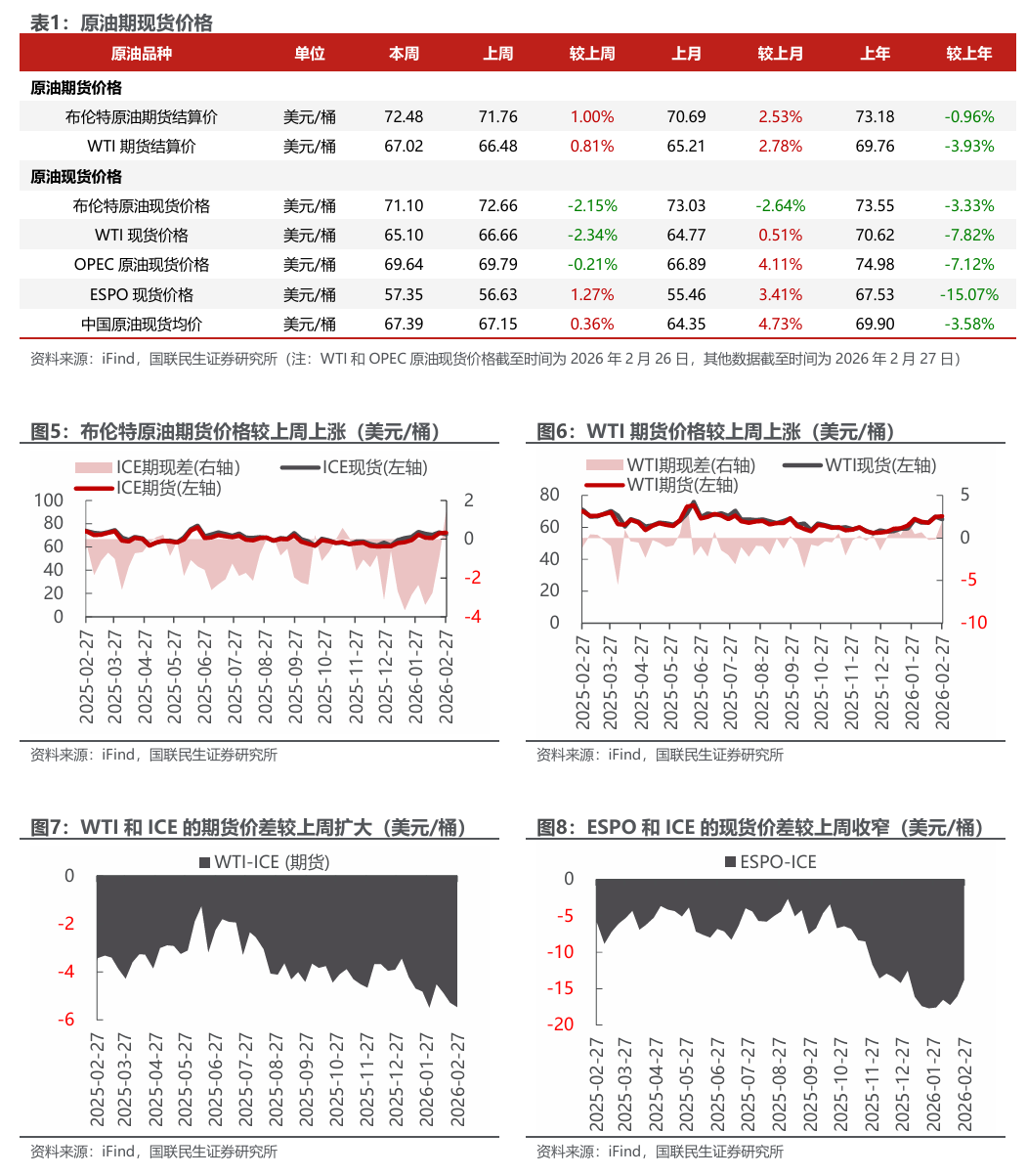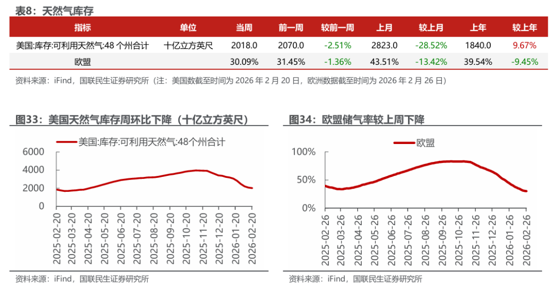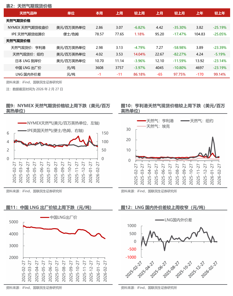 美元指数下降;布油价格上涨;东北亚LNG到岸价格下跌。截至2月27日,美元指数收于97.64,周环比-0.10个百分点。1)原油方面,布伦特原油期货结算价为72.48美元/桶,周环比 1.00%;WTI期货结算价为67.02美元/桶,周环比 0.81%。2)天然气方面,NYMEX天然气期货收盘价为2.86美元/百万英热单位,周环比-6.82%;东北亚LNG到岸价格为10.70美元/百万英热,周环比-3.96%。