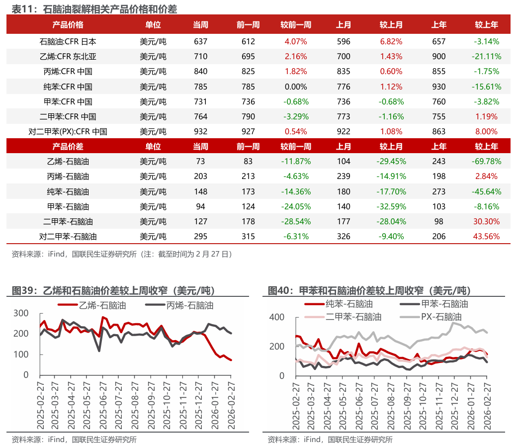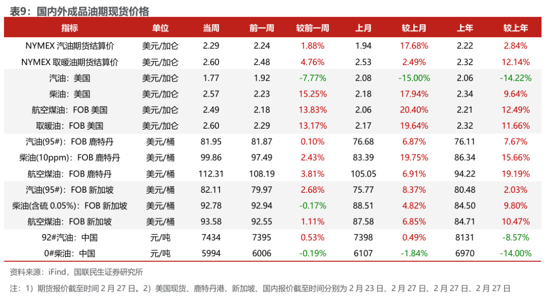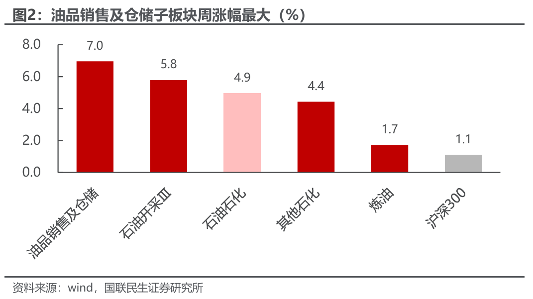 截至2月27日,本周沪深300上涨1.1%,中信石油石化板块上涨4.9%。各子板块中,油品销售及仓储子板块周涨幅最大,为7.0%;炼油子板块周涨幅最小,为1.7%。