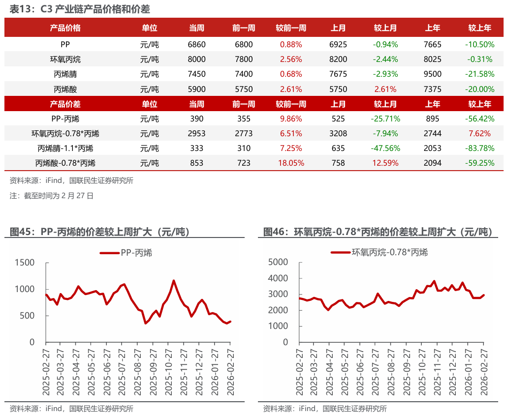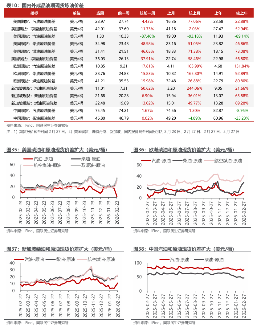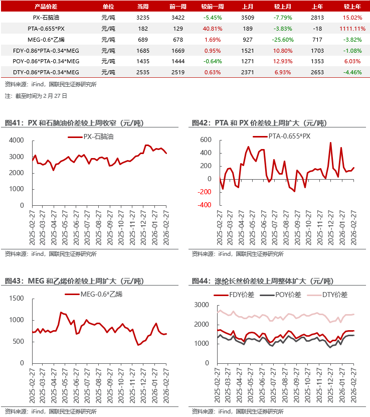 汽油价差扩大,烯烃价差收窄。截至2月27日,1)炼油板块,NYMEX汽油和取暖油期货结算价2.29/2.60美元/加仑,周环比 1.88%/ 4.76%,和WTI期货结算价差为28.97/42.01美元/桶,周环比 4.43%/ 11.73%。2)截至2月27日,化工板块,乙烯/丙烯/甲苯和石脑油价差分别为73/203/94美元/吨,较上周变化-11.87%/-4.63%/-24.05%;截至2月27日,FDY/POY/DTY价差为1685/1435/2535元/吨,较上周变化 0.95%/-0.64%/ 0.63%。