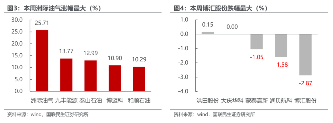 本周洲际油气涨幅最大。截至2月27日,石油石化行业中,公司周涨跌幅前5位分别为:洲际油气上涨25.71%,九丰能源上涨13.77%,泰山石迪上涨12.99%,博迈科上涨10.90%,和顺石油上涨10.29%。