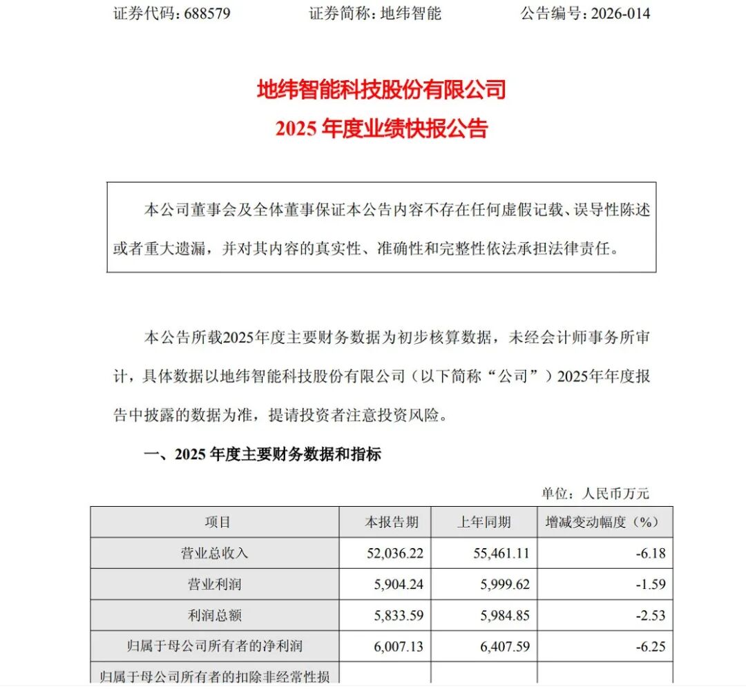 2月27日晚间,地纬智能(688579.SH,原山大地纬)发布2025年度业绩快报,全年营收、净利均现小幅下滑。公告显示,2025年地纬智能实现营业总收入5.20亿元,同比下降6.18%;归属于母公司所有者的净利润6007.13万元,同比下降6.25%;扣除非经常性损益的净利润4788.57万元,同比下降9.36%。基本每股收益0.1502元,加权平均净资产收益率4.32%。截至报告期末,公司总资产16.94亿元,归属于母公司所有者权益14.06亿元,同比增长2.34%,资产结构保持稳健。地纬智能表示,业绩下滑主要受市场竞争加剧、项目交付周期延长等外部因素影响。智慧政务、医保、用电等核心领域竞争日趋激烈,部分政府及行业客户项目进度放缓,导致收入确认节奏不及预期。同时,公司持续加大研发投入,聚焦AI、区块链等技术创新,研发费用刚性支出对短期利润形成一定压制。地纬智能成立于1992年,注册及办公地址位于济南市章丘区,2020年7月于科创板上市。作为国内领先的“AI 区块链”科技服务商,公司区块链技术在政务、医疗等领域居行业重要地位,主要业务包括智慧人社、智慧医保、智能用电等业务。该公司收入主要来自各级人社局、医保局、数据局等政府部门、医疗机构、国家电网及社会企业等客户。