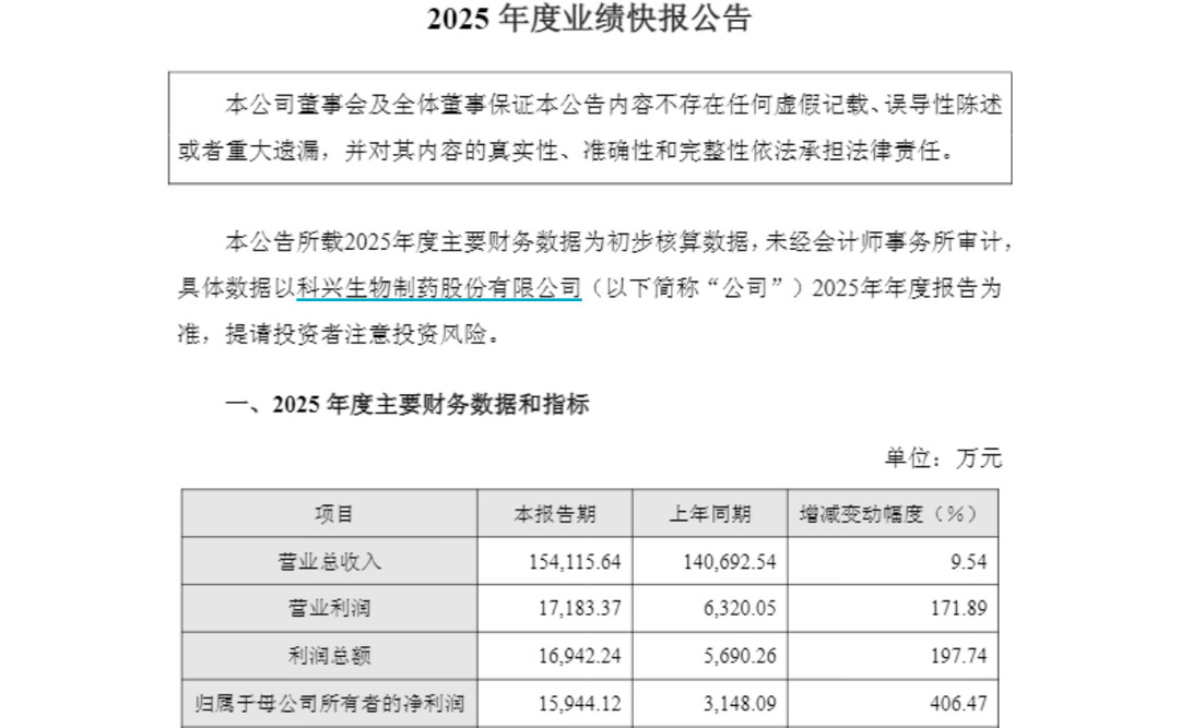 2月27日晚,科兴制药(688136.SH)披露的业绩快报显示,2025年,公司实现营业收入15.41亿元,同比增长9.54%;归母净利润1.59亿元,同比大增406.47%;扣非归母净利润为5970.62万元,同比增长69.36%。这是其在2024年扭亏为盈后营收破历史新高,净利也比上年同期涨超4倍。对于业绩增长原因,科兴制药在公告中表示,主要系报告期公司积极开拓海外市场,实现了海外收入的强劲增长,推动营业收入持续增长,归母净利润及扣非净利润均较上年同期实现大幅度提升。经过多年布局,科兴制药海外版图已覆盖欧盟、巴西、菲律宾、印尼等约70个国家和地区,构建起高效、立体的全球市场网络,核心产品出海表现尤为亮眼。在高附加值的欧盟市场,公司与合作伙伴共同推动的白蛋白紫杉醇于2024年获批上市,2025年上半年出口量占中国同类产品出口总量的47.7%,成为海外核心利润增长点。 科兴制药还表示,报告期内非经常性损益金额较上年同期增加,主要系公司持有的私募基金公允价值变动及处置下属子公司取得收益所致。 不过,科兴制药也提示称,公司尚未取得持有的私募基金重庆市招赢朗曜成长二期股权投资基金合伙企业(有限合伙)的2025年度审计报告及最终估值报告,若其最终审计报告及估值报告与该合伙企业提供的初步数据相比发生较大变化,将会对公司2025年度非经常性损益及归属于母公司所有者的净利润产生影响。科兴制药成立于1997年8月,位于济南市章丘区,2020年12月科创板上市,是一家主要从事重组蛋白药物和微生态制剂的研发、生产、销售一体化的创新型生物制药企业,专注于抗病毒、肿瘤与免疫、血液、消化、退行性疾病等治疗领域。2022年,科兴制药首现亏损,实现营收13.16亿元、归母净利润-0.9亿元;2023年,其亏损幅度进一步扩大,实现营收12.59亿元、归母净利润-1.9亿元。科兴制药在财报中提及,研发费用的增长是公司2022年及2023年业绩亏损的原因之一。其中,2022年,公司研发费用较上年同期增长57.21%,增加金额7035万元;2023年,公司研发费用达3.45亿元(占公司营业收入的比例为27.39%),同比增长78.38%。除研发费用外,财务费用也是科兴制药2023年净利下降的主要原因。当年,其财务费用高达3118.48万元,同比大增108.95%,主要系2023年借款规模同比有所增加,相应利息支出增加所致。2024年,科兴制药扭亏为盈,实现营收14.07亿元、归母净利润0.31亿元。当年,其白蛋白紫杉醇生产线获得了欧洲药品管理局GMP证书、欧盟委员会(European Commission)上市批准,并于获得上市批准的次月即开始在欧盟、英国市场实现销售,带动了海外收入实现较大增长。