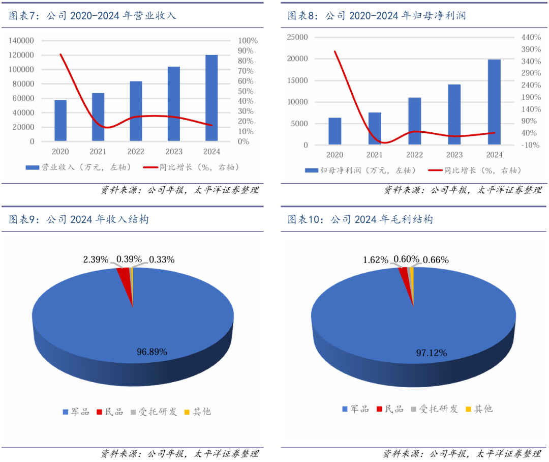 近年来,公司整体经营业绩保持平稳较快增长态势。2019-2024年公司营业收入的年复合增长率为31.36%,归母净利润的年复合增长率为72.09%,综合毛利率水平维持在30%以上。从公司 2024 年的收入和毛利结构来看,军品业务是公司主要的收入和利润来源,占比超过95%。2024年 公司军品业务实现营业收入11.67亿元,较上年同期增长17.34%。其中,弹药装备收入保持稳定 增长,导弹(火箭)固体发动机动力模块收入实现快速增长。
