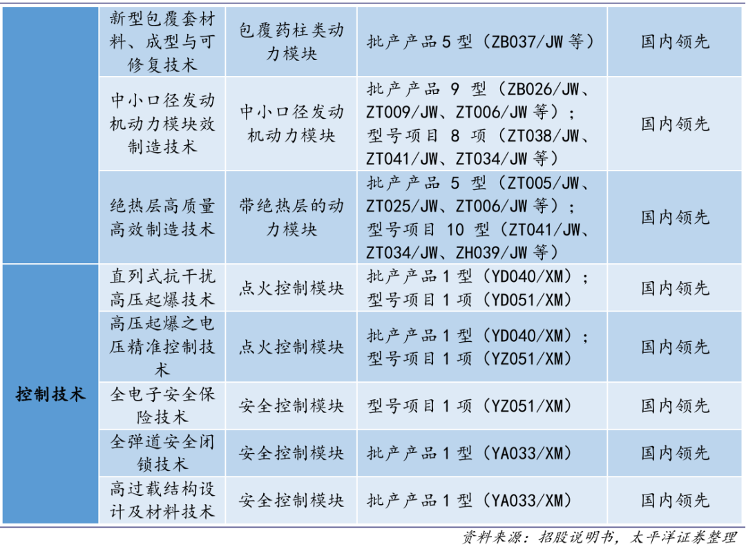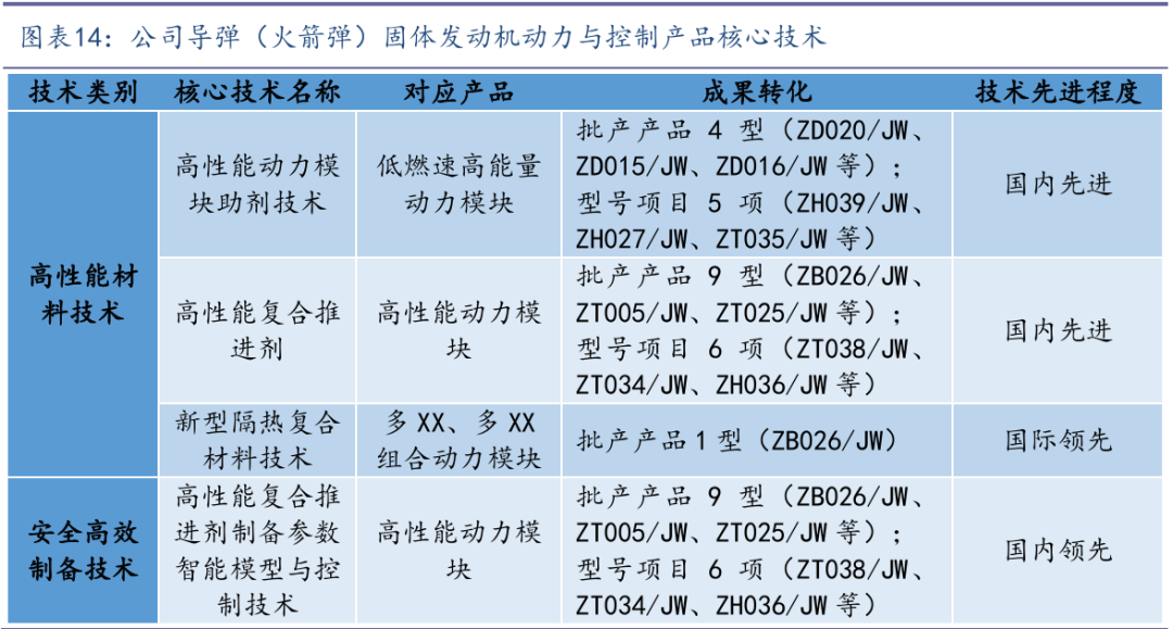在导弹(火箭)固体发动机动力领域:公司是国内少数从事导弹(火箭)固体发动机动力模 块及总装科研生产的企业之一,发动机动力模块产品广泛应用于各类导弹、火箭弹系统动力;发动机总装主要应用于靶弹、各类助推器。凭借多年自主研发积累,在高性能材料技术与安全高效 制备技术等产品研制与生产全领域形成了完善的自主技术体系,具有全产品自主研发技术能力,掌握多项核心技术,部分技术达到国际领先水平。