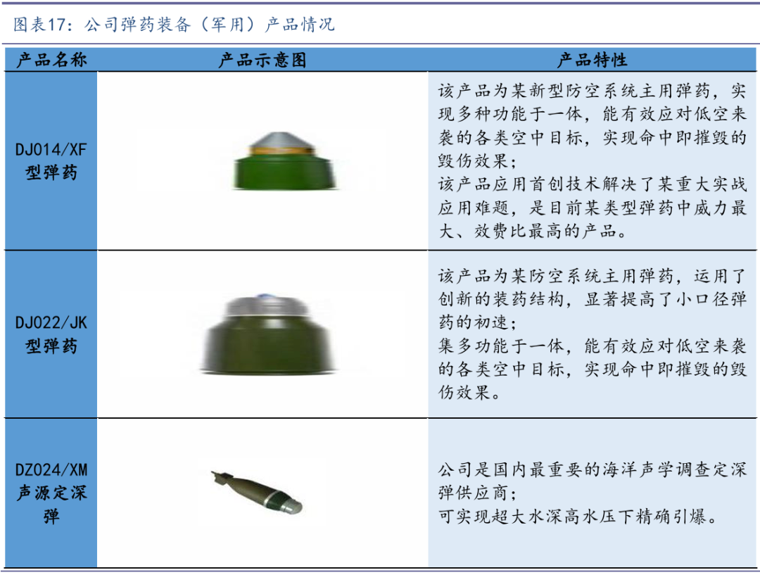 在弹药装备领域:公司是国内重要的弹药装备研制生产企业之一,主要产品包括主用弹药、特种弹药和引信及智能控制产品,广泛应用于防空反导、装甲突击、反恐处突、海洋调查等多个 领域。通过长期研发及型号迭代,公司围绕弹药建立并完善了自有技术体系,拥有各类型弹药的完整研发技术能力。在弹药总体设计、精度控制、毁伤效果等核心环节积累多项研发成果和核心 技术,在小口径防空反导弹药方面具备国内先进水平,多项关键技术和产品处于行业领先水平。 目前,公司正在由常规弹药向智能化、信息化弹药转型,未来有望充分受益行业高景气。