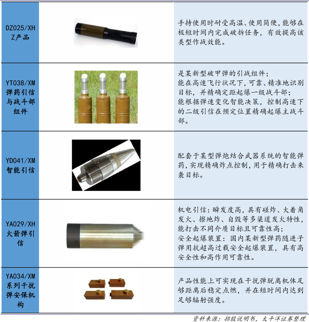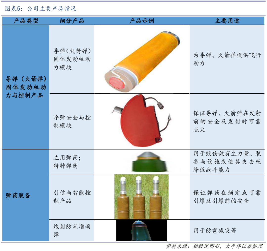 在弹药装备领域:公司是国内重要的弹药装备研制生产企业之一,主要产品包括主用弹药、特种弹药和引信及智能控制产品,广泛应用于防空反导、装甲突击、反恐处突、海洋调查等多个领域。通过长期研发及型号迭代,公司围绕弹药建立并完善了自有技术体系,拥有各类型弹药的 完整研发技术能力。在弹药总体设计、精度控制、毁伤效果等核心环节积累多项研发成果和核心技术,在小口径防空反导弹药方面具备国内先进水平,多项关键技术和产品处于行业领先水平。同时,公司应用成熟军品技术投入民用领域,生产的炮射防雹增雨弹系行业首型B级弹(高炮形 式作业),具备消雹效果好、性价比高、安全可靠性高等优良特性,产品已应用于云南、贵州、四川等多个省份。