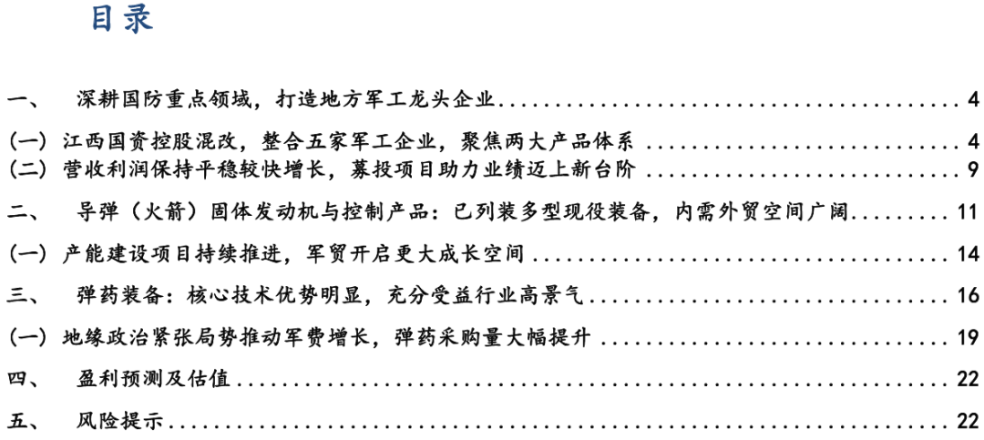 在导弹(火箭)固体发动机动力领域:公司是国内少数从事导弹(火箭)固体发动机动力模 块及总装科研生产的企业之一,发动机动力模块产品广泛应用于各类导弹、火箭弹系统动力;发动机总装主要应用于靶弹、各类助推器。凭借多年自主研发积累,在高性能材料技术与安全高效 制备技术等产品研制与生产全领域形成了完善的自主技术体系,具有全产品自主研发技术能力,掌握多项核心技术,部分技术达到国际领先水平。随着“固体火箭发动机制造应急能力建设项目” 和“航天动力建设项目”的持续推进,不仅能够满足新批产任务交付需求,更有助于公司在产业 链上的延伸拓展。军贸订单落地将为公司开启更大成长空间,未来业绩有望续创历史新高。