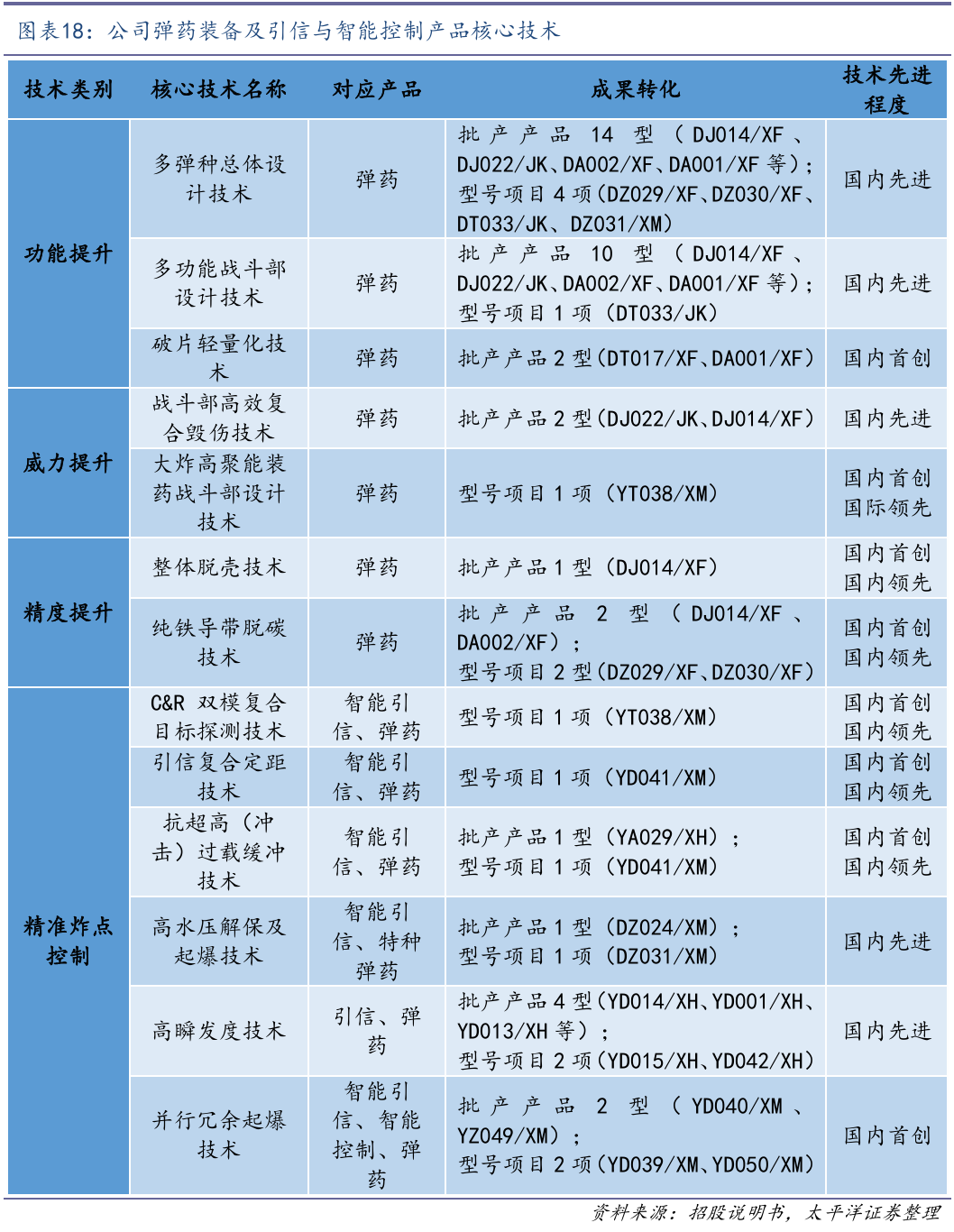 公司在弹药装备领域的核心技术主要体现在弹药总体设计技术、弹药战斗部技术、引信精确探测等方面。在弹药总体设计技术方面,经过长期各类弹种、多型号研制任务历练,较一般弹药企业仅具有单一弹种或少数弹种研发能力相比,公司掌握了全弹种总体设计技术,处于行业先进行列;在弹药战斗部技术方面,公司开发的战斗部高效毁伤技术,弹药毁伤性能得到大幅度提升,处于国内先进水平;在引信精确探测方面,公司已形成了多种智能引信技术体制,首创的C&R双模复合目标探测技术,应用于主战坦克弹药,首次实现某重要作战功能。