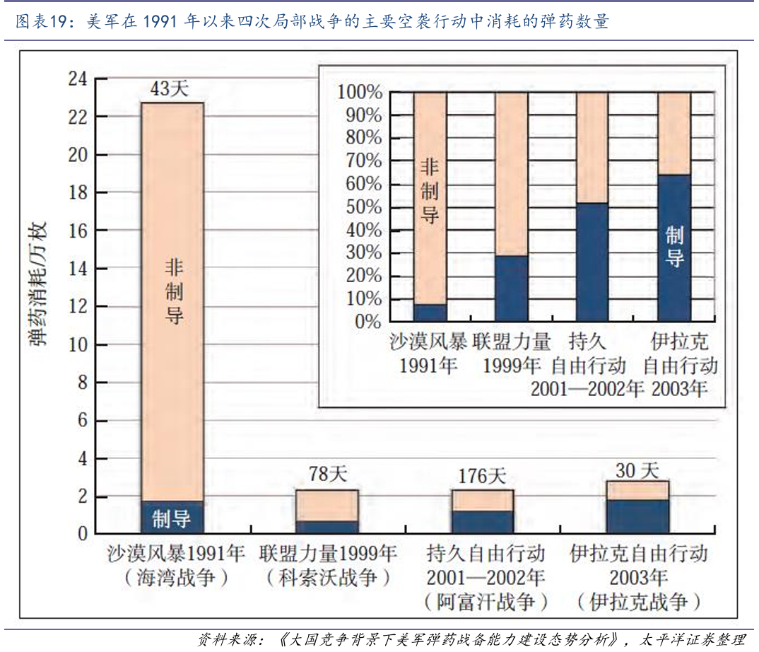 近年来,美军大幅增加弹药采购,采购数量达近20年来峰值。以精确制导弹药为例,基于对 美国国防部历年来预算文件中武器采购情况的统计,2001-2017年,美军采购的骨干精确制导弹药数量达46万枚,以保障打赢历次小规模局部战争。特朗普政府上台以来,美国着眼打赢大规模战争,大幅提升弹药采购数量,2018-2020年新增采购20万枚,几乎达到过去17年采购总量的一半。根据国防部2021财年预算文件,在2018-2020年新增采购20万枚基础上,2021-2025年初步安排再采购13.60万枚。据CSBA统计,美军在1991年以来四次局部战争(海湾战争、科索沃战争、阿富汗战争、伊拉克战争)的主要空袭行动中,共消耗精确制导弹药约5.40万枚,而2018-2025年采购的33.60万枚精确制导弹药中,空地弹药采购量达21.60万枚,相当于过去15场局部战争的消耗量。近年来,美军将提升弹药战备水平作为重点工作予以大力推进。2017年, 美国国防部采办与保障(A&S)副部长办公室成立了弹药战争室(Munitions War Room),以摸底 弹药库存短缺状况及产能约束因素。2018年,美国国防部办公厅(OSD)启动弹药战备计划(MRI), 并在2019年4月公开的《改革国防部运行机制提升效率初始计划》文件中,将弹药战备作为美军供应链与后勤改革的三大顶级任务之一。