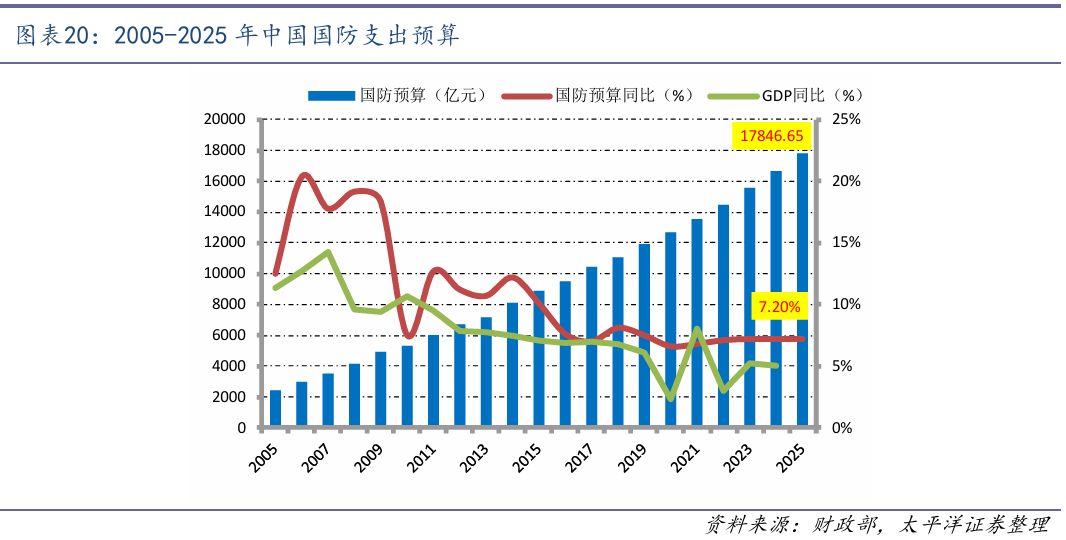 根据2025年3月5日公布的中央和地方财政预算草案报告,2025年我国国防支出预算为17846.65亿元,同比增长7.20%。我国国防支出主要是用在加大武器装备建设投入,淘汰更新部分落后装备,升级改造部分老旧装备,研发采购大型水面舰艇、先进战机、飞行武器等新式武器装备,稳步提升武器装备现代化水平。目前,美国军费占GDP的比重大于3%,北约成员国中有23个国家的防务支出占GDP的比重超过2%。相比之下,我国国防支出占GDP的比重还不到1.5%,未来仍有较大提升空间。随着现代战争形态向信息化、智能化方向加速演进,传统弹药体系正面临革命性升级需求,对信息化弹药的需求也将逐渐增大。信息化弹药本身技术含量较高,结构复杂,而且大量采用电子元器件、光学器件等,与传统弹药相比,其储存寿命会有所下降,更新采购的比例较高。在国防现代化进程加速推进的背景下,部队实战化训练强度持续提升,智能化装备列装规模快速扩大,弹药消耗基数呈现结构性增长态势。