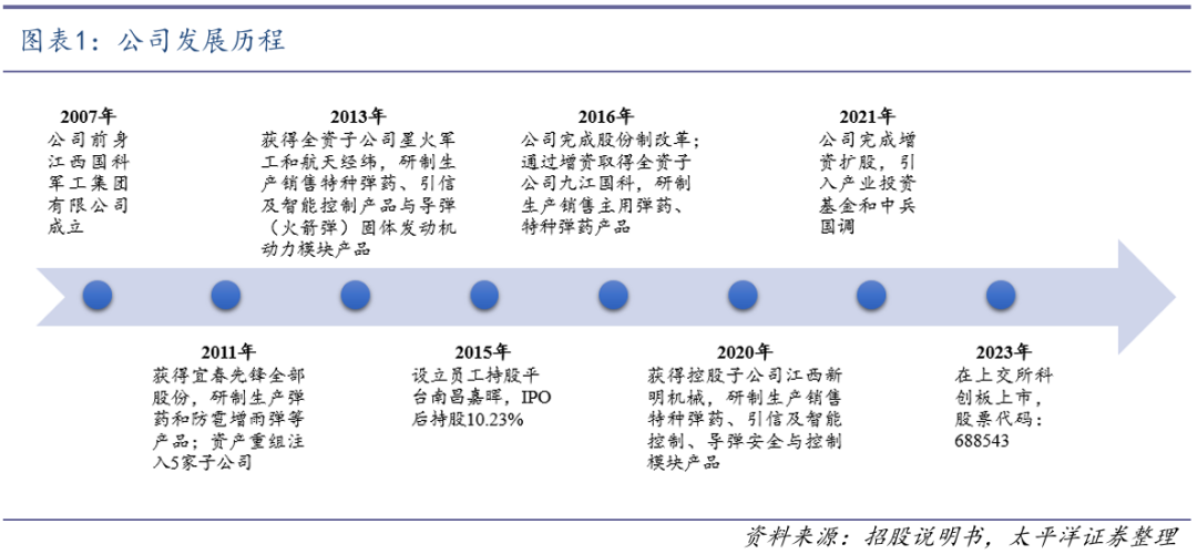 公司前身“江西国科军工集团有限公司”于2007年12月29日注册成立,是江西省军工控股 集团所属的国有控股混改企业。2011年,公司获得宜春先锋全部股份并通过资产剥离和重组继承 了5家子公司全部军品业务及其相关知识产权,初步构建起以导弹固体发动机动力与控制、弹药 装备为核心的产品体系,为后续专业化发展奠定了基础。2013年获得全资子公司星火军工和航天 经纬。2016年公司完成股份制改革,整体变更为江西国科军工集团股份有限公司,并于同年获得全资子公司九江国科。2020年获得控股子公司新明机械,2021年完成增资扩股,引入产业投资基 金和中兵国调。2023年公司在上交所科创板上市,股票代码:688543。