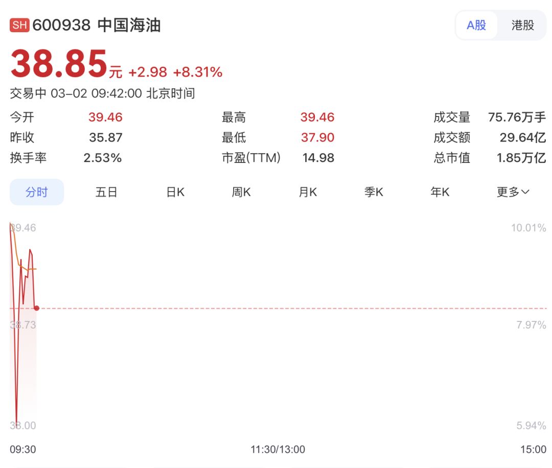 石油石化板块领涨,“三桶油”中,中国海油盘中涨停,中国石油开盘暴涨8.66%,中国石化开盘大涨6%,截至发稿涨幅有所回落。煤炭、国防军工等板块亦领涨。
