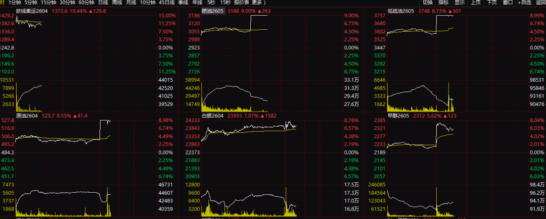 燃油期货主力合约也强劲拉升,最高触及涨停,涨幅达9%,低硫油期货、原油期货盘中亦触及涨停,多个化工品期货也随之强劲大涨;国内白银期货主力合约亦强劲上涨,盘中涨幅超过8%;国内黄金期货主力合约亦上涨,盘中涨幅超过3%。