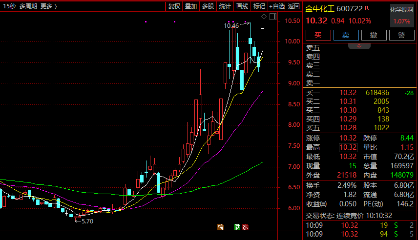 化工板块反复活跃,金牛化工(600722)走出11天5板,超60万手买单封涨停,金瑞矿业、红星发展、兴化股份涨停,四川美丰、宝丰能源、华谊集团、山东海化等跟涨。