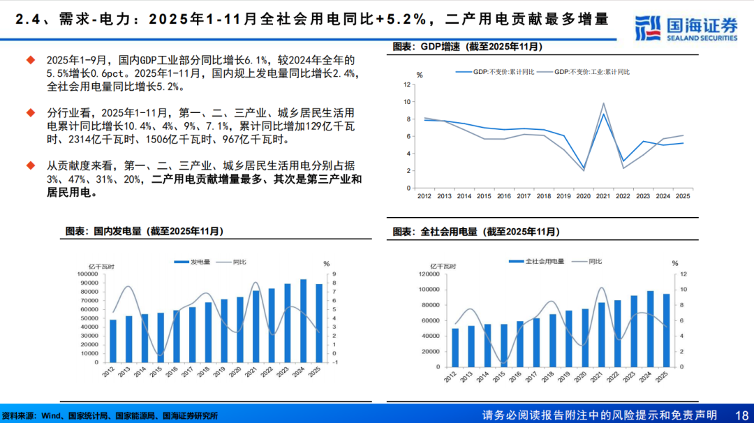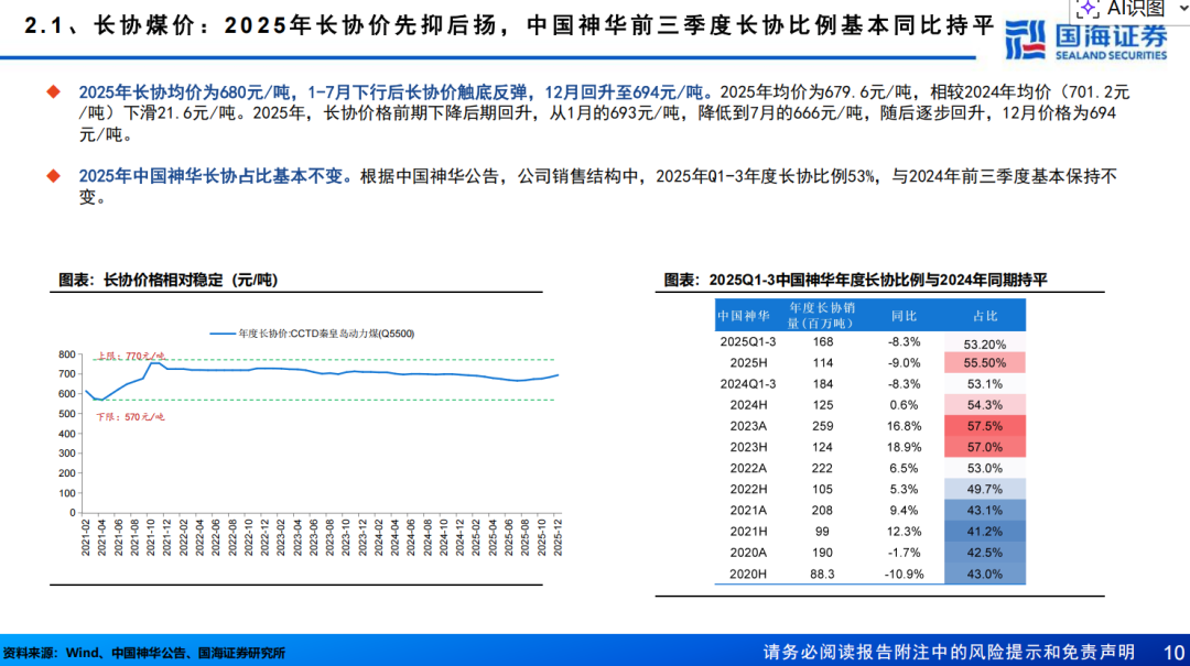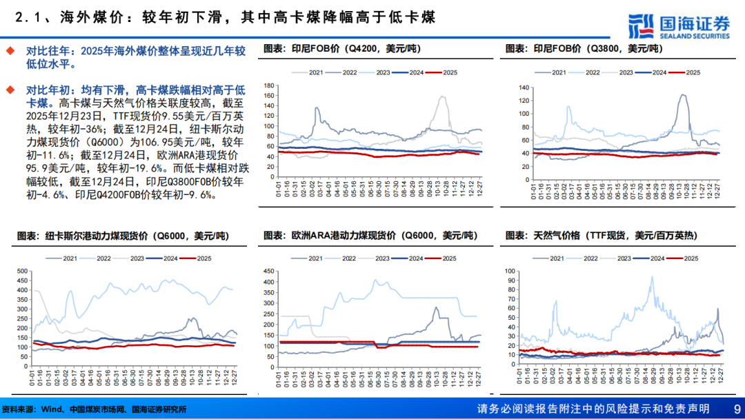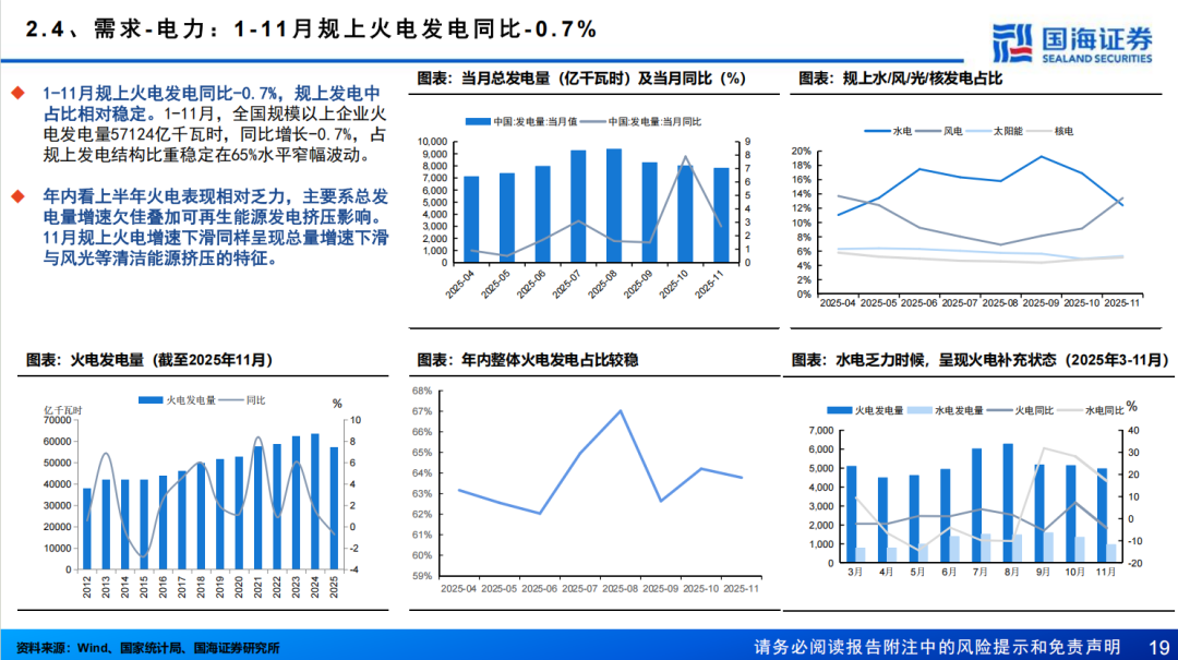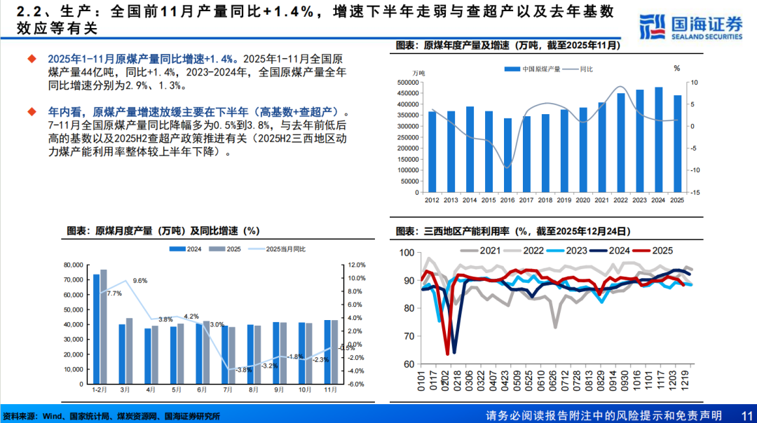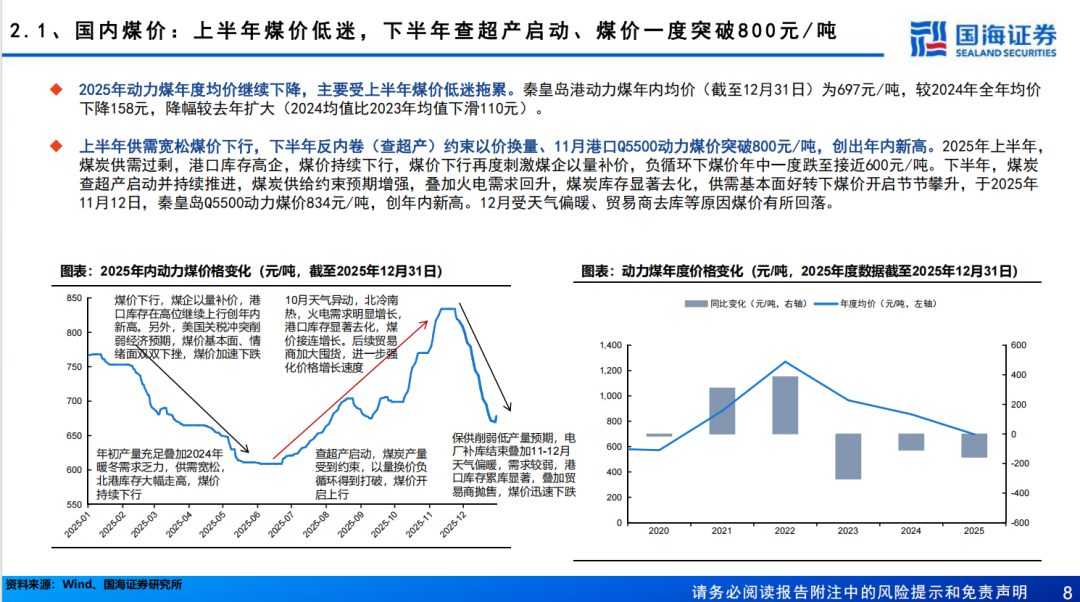一、复盘动力煤:年内煤价V字走势,下半年查超产托底煤价回升。2025年港口动力煤均价697元/吨(截至2025/12/31,同比-158元/吨),长协年度均价680元/吨(同比-22元/吨)。上半年煤炭供需宽松,企业以量换价加剧矛盾,煤价一度跌至接近600元/吨。7月份,查超产启动打破以量换价负循环,7-11月全国原煤产量同比增速跌至-0.5%至-3.8%之间,与此同时火电需求回升叠加冶金化工需求韧性较佳,煤炭库存显著去化,供需基本面好转下煤价开启节节攀升,11月创年内新高834元/吨。12月受天气偏暖、贸易商去库等原因煤价有所回落。