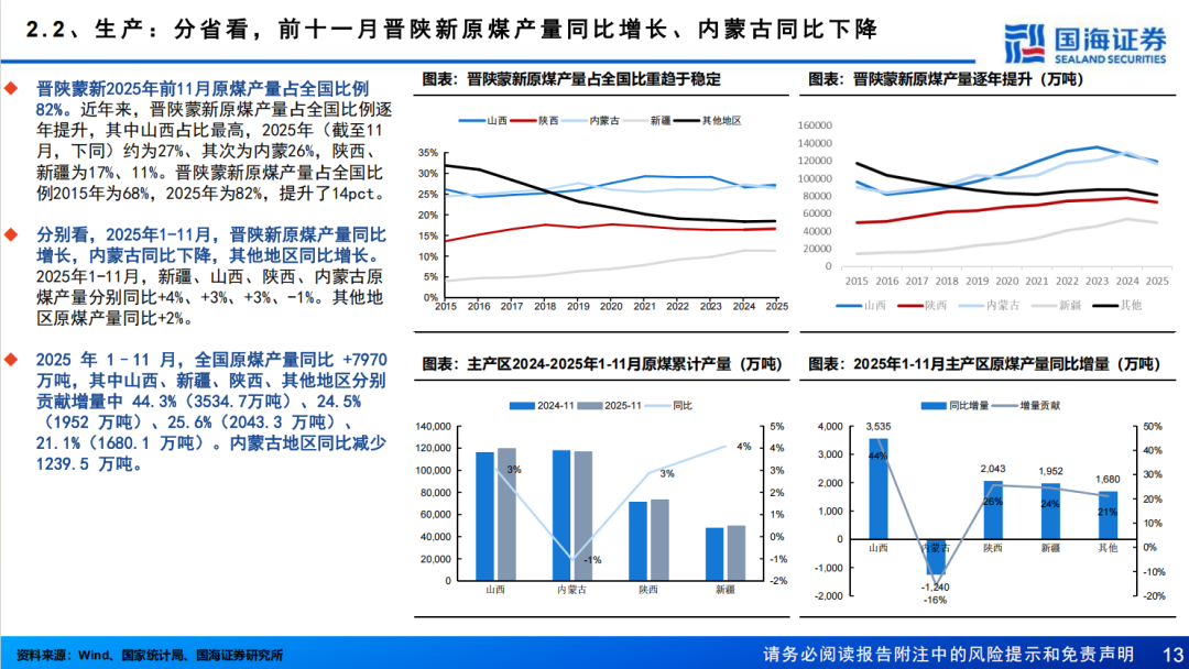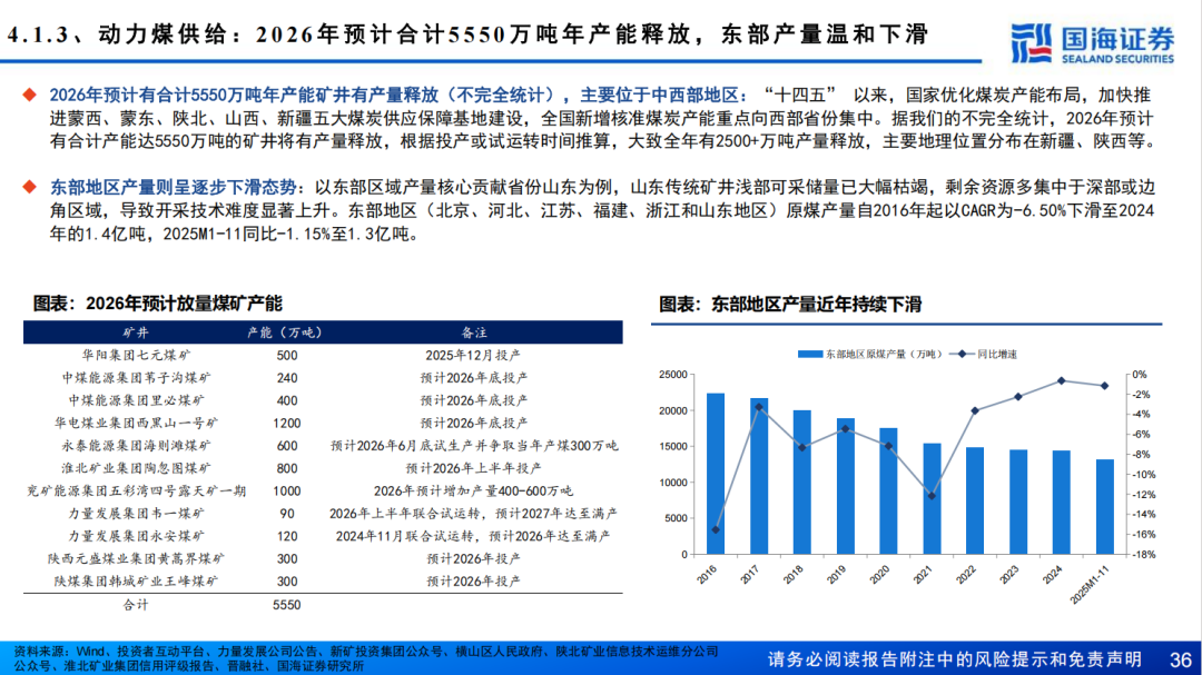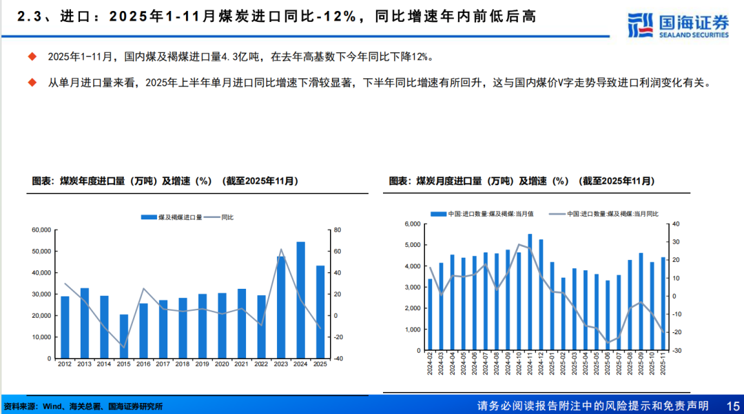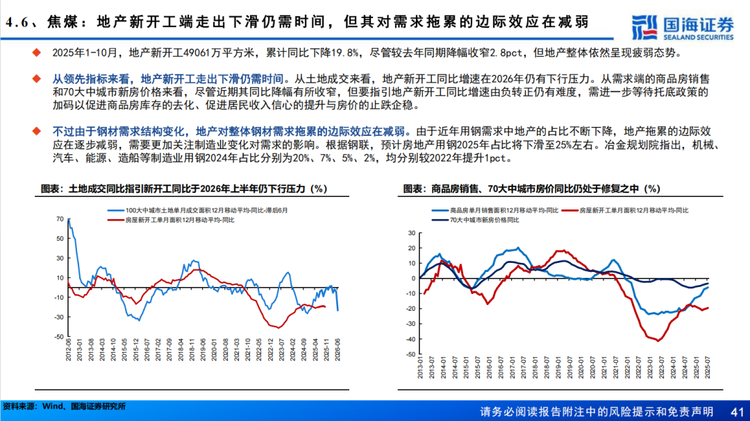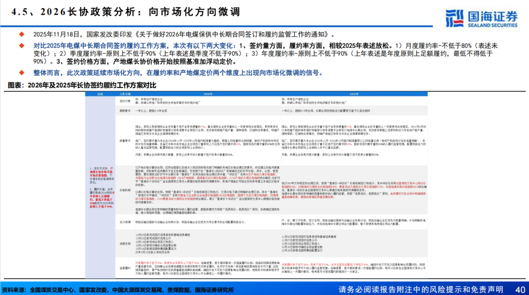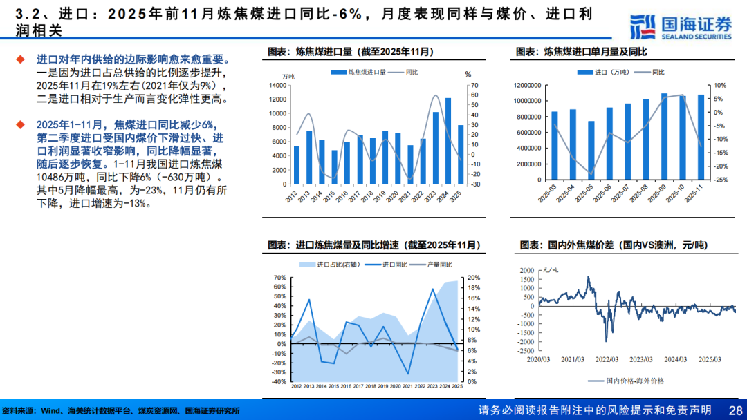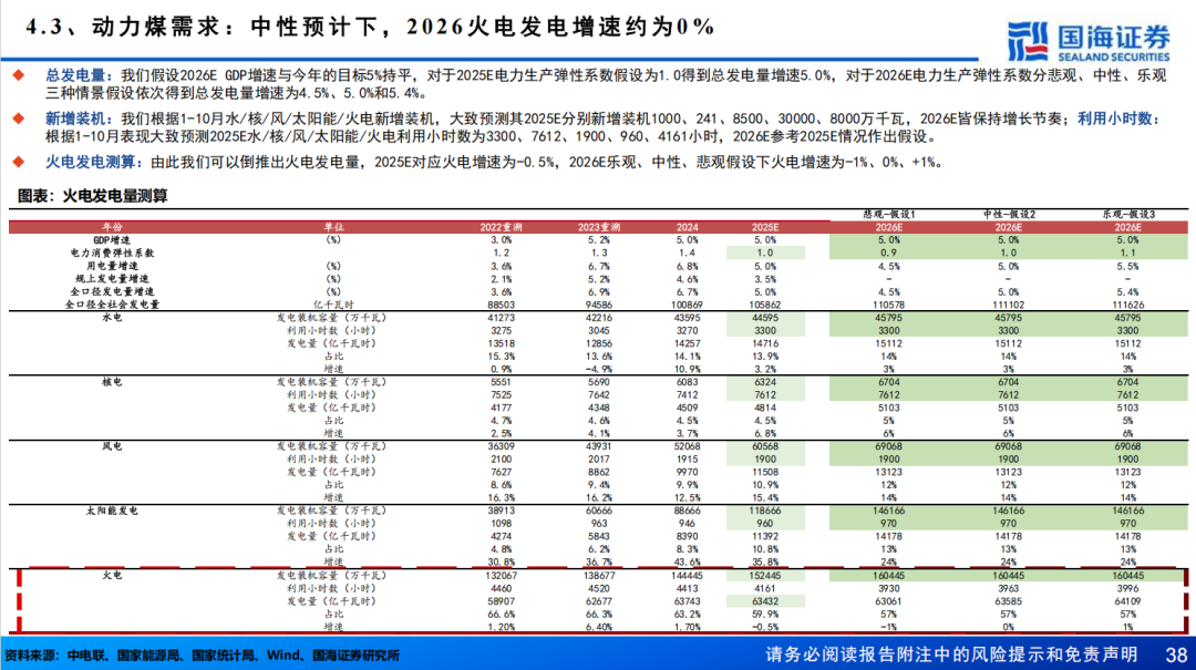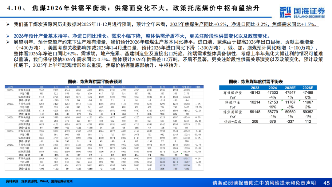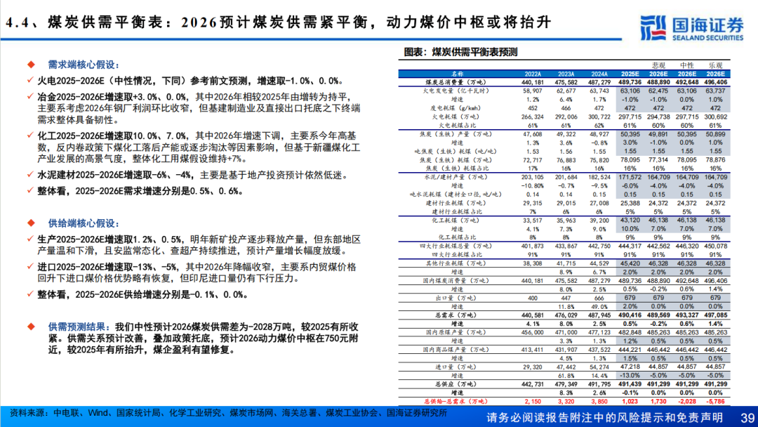 三、2026年展望:供需测算紧平衡,港口动力煤/主焦煤价格中枢或升至750/1550元/吨。动力煤方面,供给端,我们考虑查超产安监常态化约束现有产能开工率、部分新矿产量释放、东部地区产量温和下滑等,中性预计2026年产量同比 0.5%;内贸煤价格回升收敛进口煤优势,但印尼进口量仍有下行压力,中性预计2026年进口同比-5%。整体预计动力煤2026年供给同比持平。需求端,我们中性假设2026年火电、冶金同比持平、化工同比 7%,建材同比-4%,预计整体需求增速 0.6%。故此,我们中性测算2026年煤炭供需差-2028万吨,较2025年有所收紧,供需修复、叠加政策托底,预计2026年动力煤价中枢在750元/吨。炼焦煤方面,预计查超产约束下生产难有增量(预计同比持平),进口端蒙煤预计有所增长,整体进口预计同比 2%。需求端,地产拖累、但基建制造业及钢材出口托底,终端需求整体具备韧性,不过考虑2025上半年焦化大幅让利的情况可能难以重演,我们保守预估2026年需求同比-0.5%。整体预计2026年供需差112万吨,矛盾不显著,预计政策托底下,2025年上半年悲观情形难以重演,焦煤价格有望底部抬升、中枢抬升。