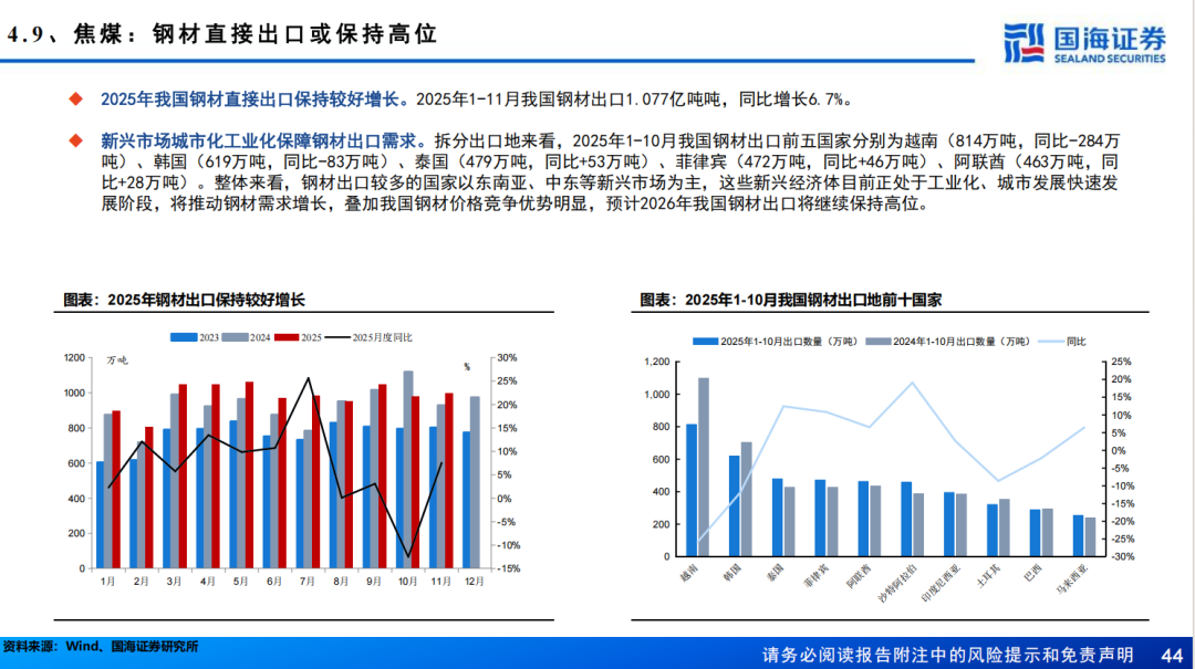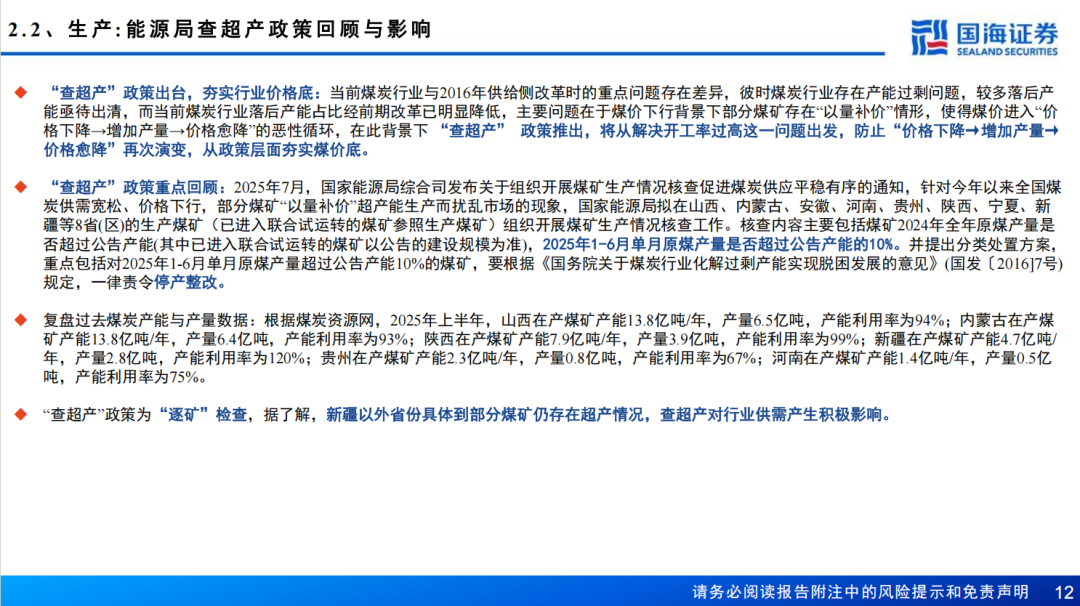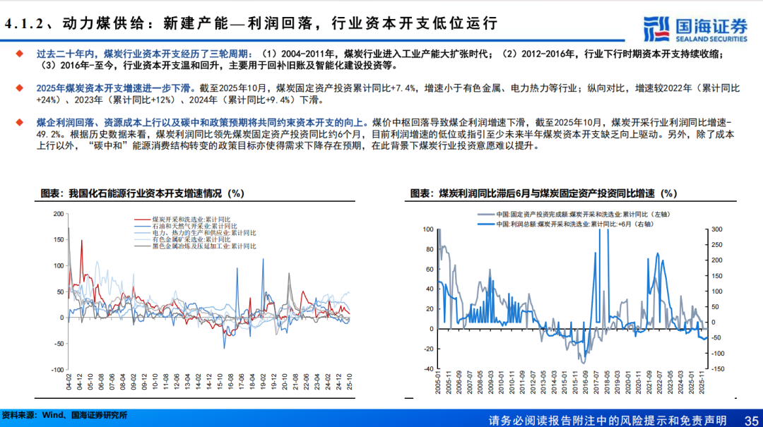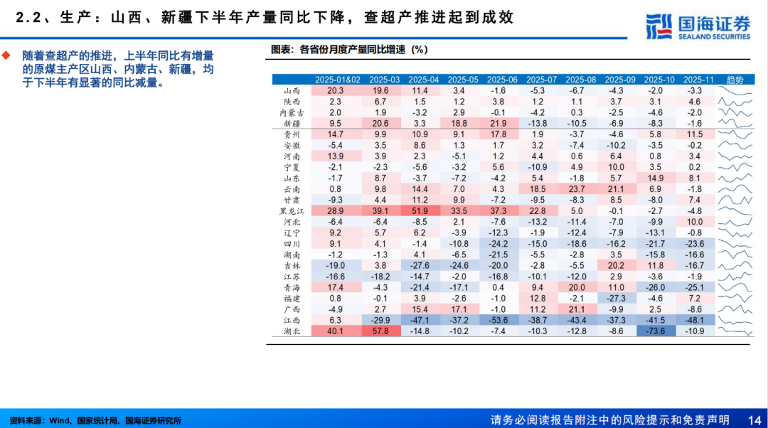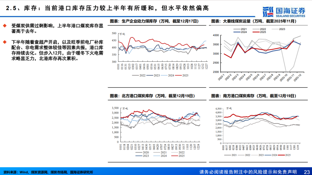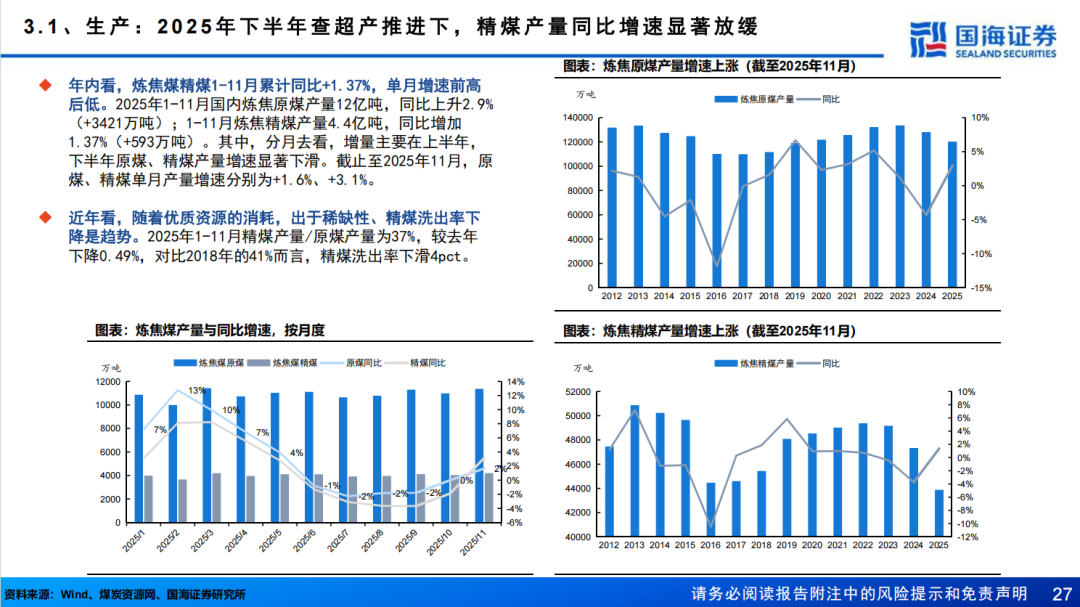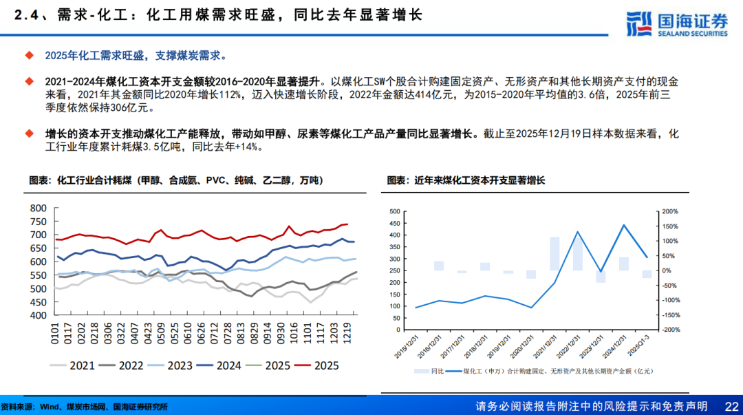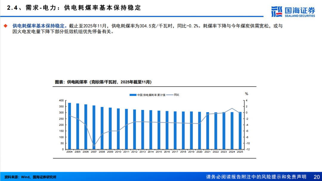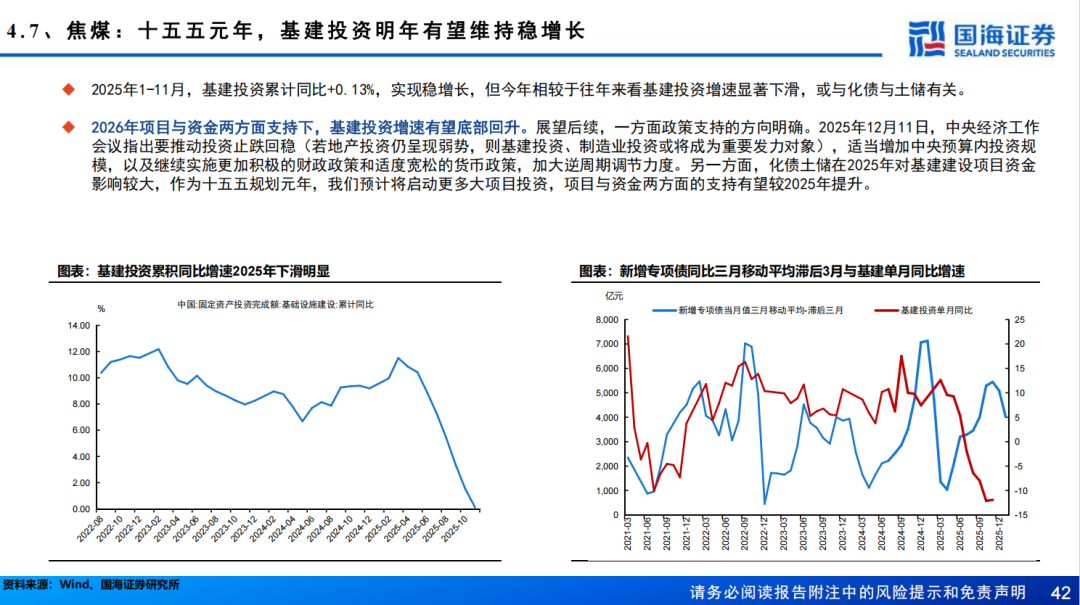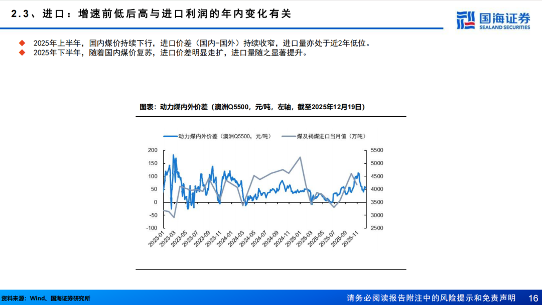 三、2026年展望:供需测算紧平衡,港口动力煤/主焦煤价格中枢或升至750/1550元/吨。动力煤方面,供给端,我们考虑查超产安监常态化约束现有产能开工率、部分新矿产量释放、东部地区产量温和下滑等,中性预计2026年产量同比 0.5%;内贸煤价格回升收敛进口煤优势,但印尼进口量仍有下行压力,中性预计2026年进口同比-5%。整体预计动力煤2026年供给同比持平。需求端,我们中性假设2026年火电、冶金同比持平、化工同比 7%,建材同比-4%,预计整体需求增速 0.6%。故此,我们中性测算2026年煤炭供需差-2028万吨,较2025年有所收紧,供需修复、叠加政策托底,预计2026年动力煤价中枢在750元/吨。炼焦煤方面,预计查超产约束下生产难有增量(预计同比持平),进口端蒙煤预计有所增长,整体进口预计同比 2%。需求端,地产拖累、但基建制造业及钢材出口托底,终端需求整体具备韧性,不过考虑2025上半年焦化大幅让利的情况可能难以重演,我们保守预估2026年需求同比-0.5%。整体预计2026年供需差112万吨,矛盾不显著,预计政策托底下,2025年上半年悲观情形难以重演,焦煤价格有望底部抬升、中枢抬升。