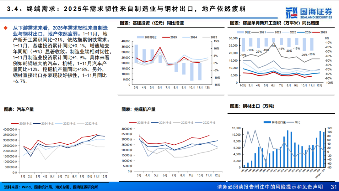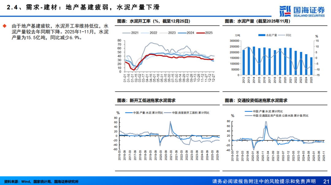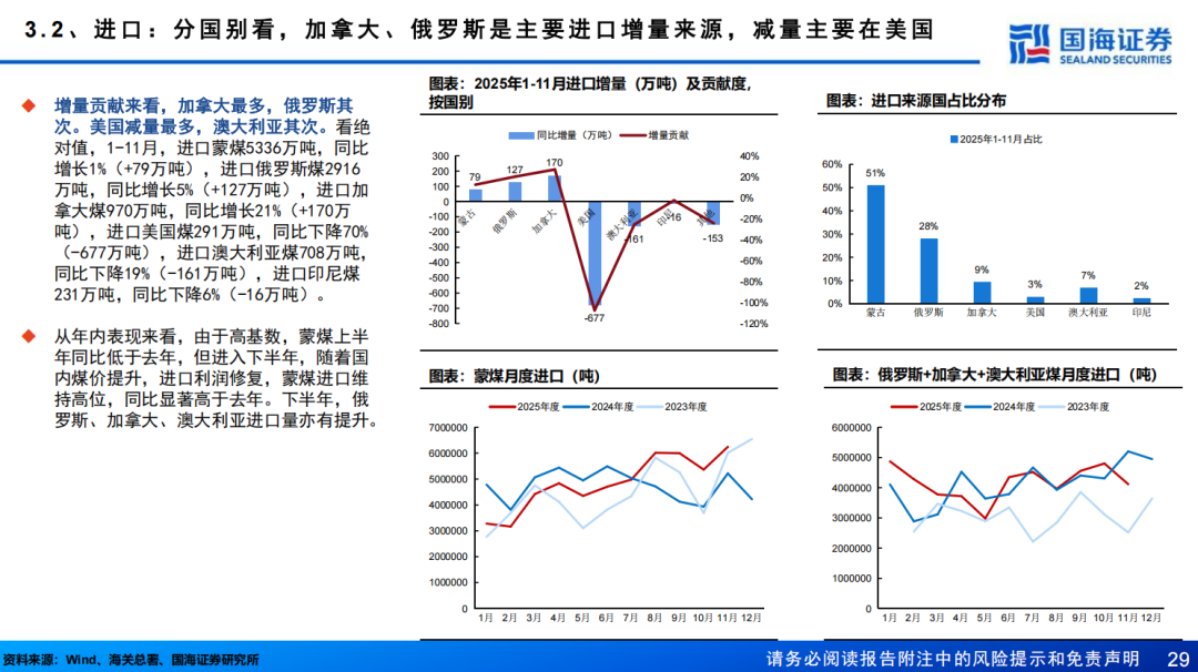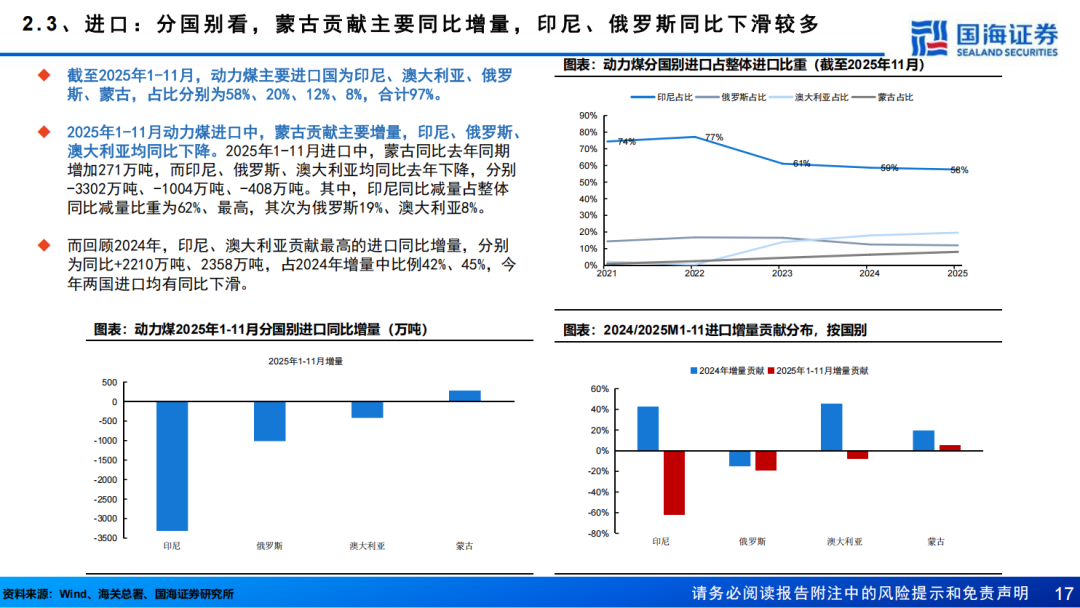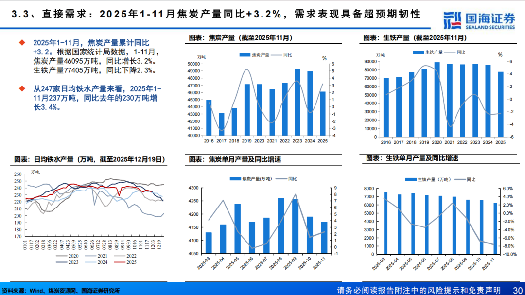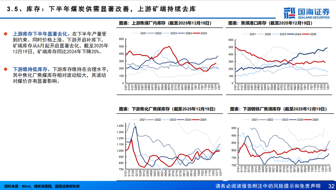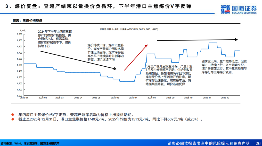 二、复盘炼焦煤:反内卷改善预期,低产量低库存下煤价快速上涨。2025年港口主焦煤均价1513元/吨(截至2025/12/31,同比-509元/吨)。炼焦煤同样呈现年内V字走势,上半年高产量高库存、煤价持续下跌。三季度始,随着安监环保趋严、查超产启动,供给收缩预期加强,叠加需求端铁水产量较佳(2025年1-11月同比 3%),以及下游低库存状态下随煤价上涨被动开启补库,矿山库存迅速去化,煤价快速反弹。而步入四季度,尽管生产维持低位,但蒙煤进口受利润修复显著提升,多空交织之下,煤价多震荡运行,政策预期与下游库存行为主导煤价变化。